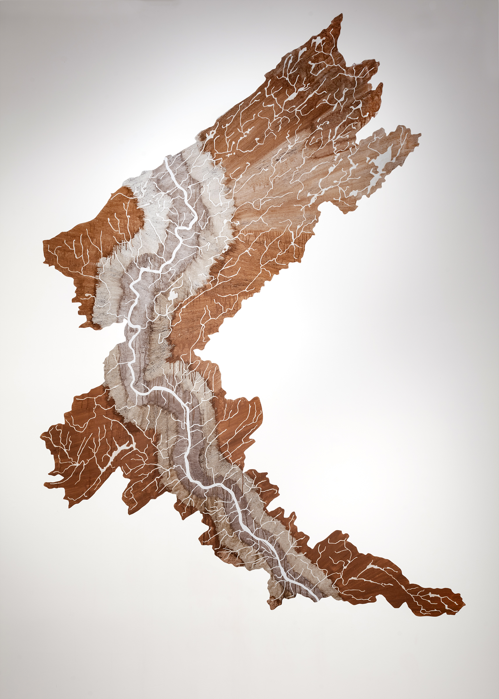 I made the first of these maps in 2005 with sedimentary rocks gathered along the Haw River in the Piedmont region of North Carolina. I ground the stones by hand with a small mortar and pestle, mixed the resulting powdery pigment with river water, and brushed it directly onto the gallery wall in long, horizontal strokes, coating the entire 10ft tall by 15ft wide surface in a wash of reddish dust. While projecting an image of the Haw and its tributaries onto this painted surface, I saturated a small brush in river water and used it to trace each stream, erasing one meandering line after another from the field of rock dust. This process of erasure evokes the way that water marks the landscape by eroding rock and soil in its path from ridge to valley. I’ve since depicted several other watersheds in this fashion, painting directly onto gallery walls with the most basic substances of rock and water, and then washed them away at the conclusion of each exhibition. I’ve also developed a more permanent series of works on paper using these site-specific pigments.