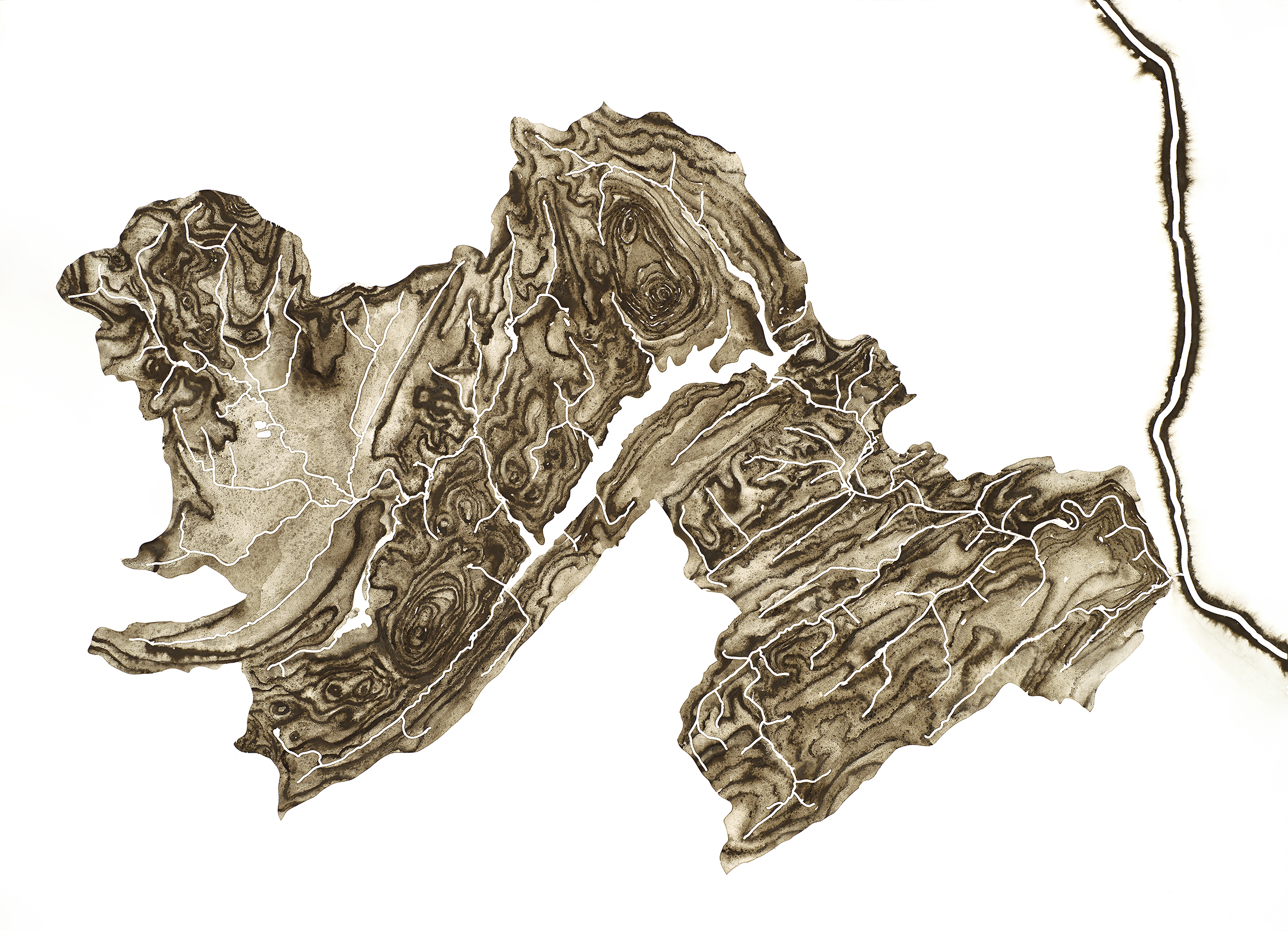 Over the last several years, I’ve been combining abstract analytical representations of landscapes with perceptual records of the world to examine the intersection of these macro- and micro-scaled interpretations of place. One body of work that has emerged from this inquiry is an ongoing series of watershed maps, created using pigments made from rocks collected along lakes and streams. These maps render physical geographies with raw materials filtered through a tangible human connection with nature. In this way, each map is a visual artifact of my experience exploring a particular stream, river, or lake, and holds evidence of time spent wandering in the woods, transforming rocks into pigment, and examining the specific shapes of each basin.