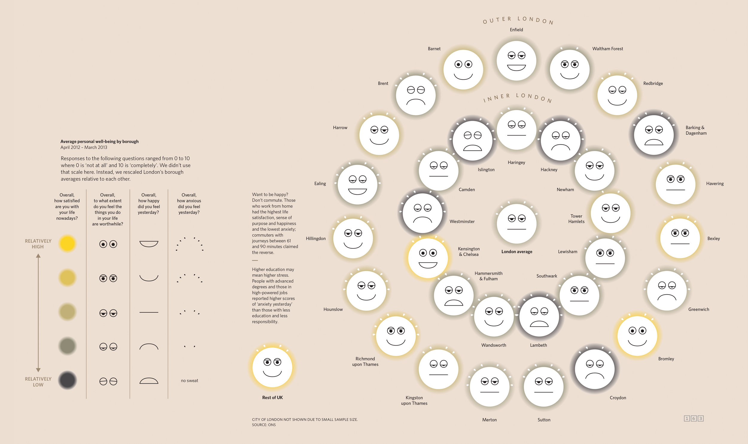 For example, what if we took some data on life satisfaction, sense of purpose, happiness, and anxiety and converted each metric into a different facial attribute? Now what if we combined them and applied this conversion to all thirty-three of London’s boroughs? Numbers becomes faces become a map.