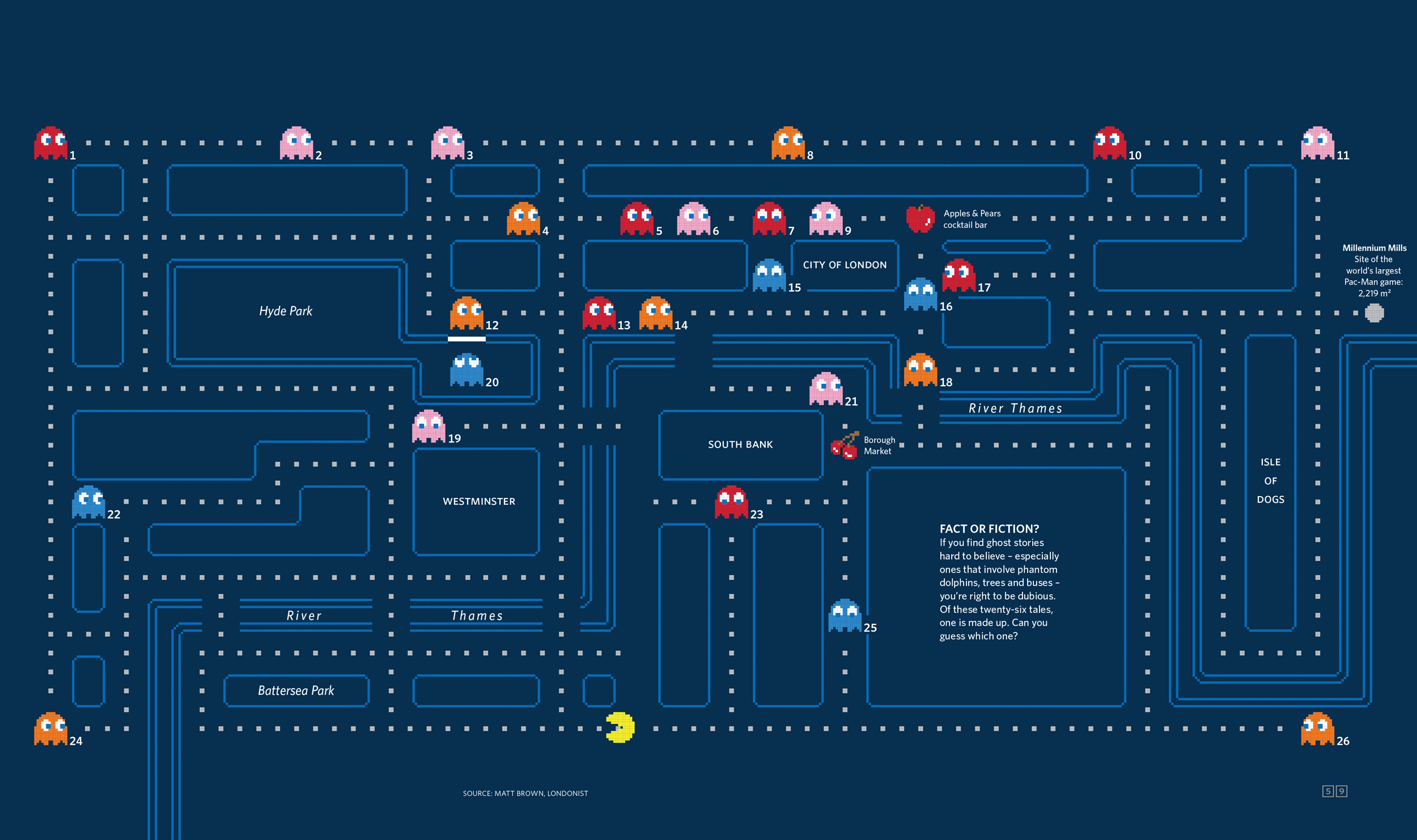 For another graphic, we had a list of haunted locations around London that we wanted to map. So I said, “OK brain, what’s something visual and modular that involves ghosts?” This soon escalated to correspondence with the Pac-Man permissions teams at Namco in Japan. Upon submitting a draft, Namco informed us that “pretzel and pear cannot be used. Please [replace with] apple and strawberry.” We replied with an amended design, to which we received the following: “Stems of apple and cherry have to be brown (please refer to the design guide for the exact color).” I took this as a good reminder that even when you’re being imaginative, details matter. They’re what make the metaphor convincing.