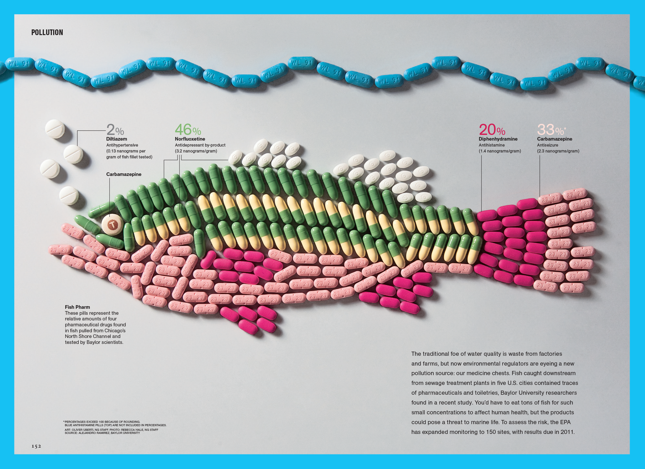 A few months after the napkin map, the magazine was preparing a special issue on the world’s water crisis. A story was proposed on an EPA study that had found trace amounts of pharmaceuticals in fish in watersheds around the country. I was asked if I had an idea of how we might visualize it. “Easy,” I said. “We’ll make a fish out of pills.”