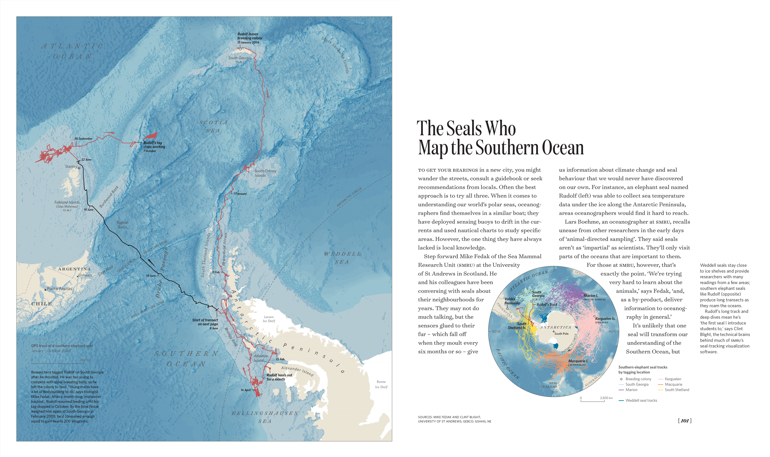 Working together, geographer and designer, we help scientists find and show narratives in their data. Perhaps counterintuitively, this is mostly an exercise in data reduction. We are both fond of saying that a large part of our job is cleaning hairballs. Take “The Seals Who Map the Southern Ocean.” This map started out as a mass of lines showing the routes traveled by hundreds of seals around Antarctica. The initial impact came from the sheer volume of tracks collected. Beyond that, we realized the tangle did not communicate much else. Our solution was to extract the journey of a single seal named Rudolf and add annotations and contextual detail such as bathymetry and ocean temperature to help readers grasp what a seal can teach us about warming seas.