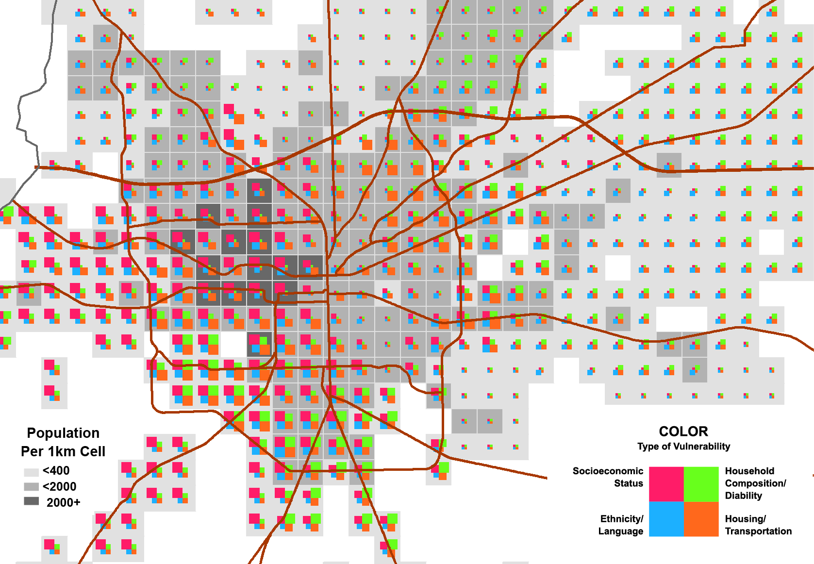 To create maps that conveyed both vulnerability level and population density, we decided to create a grid of 1km vector cells, with each cell containing both density and SVI data (Zhou et al. 2017). We would then be able to vary the color of the cells to indicate the level of vulnerability, and their size to indicate population density; Figure 3 features an example. This grid-based representation would alleviate some of the well-documented problems of choropleth maps, such as inconsistently sized areal units and “data cliffs” where values abruptly change at an area’s border (Langford 2013; Mennis 2003; Martin, Lloyd, and Shuttleworth 2011; Jia, Qiu, and Gaughan 2014).