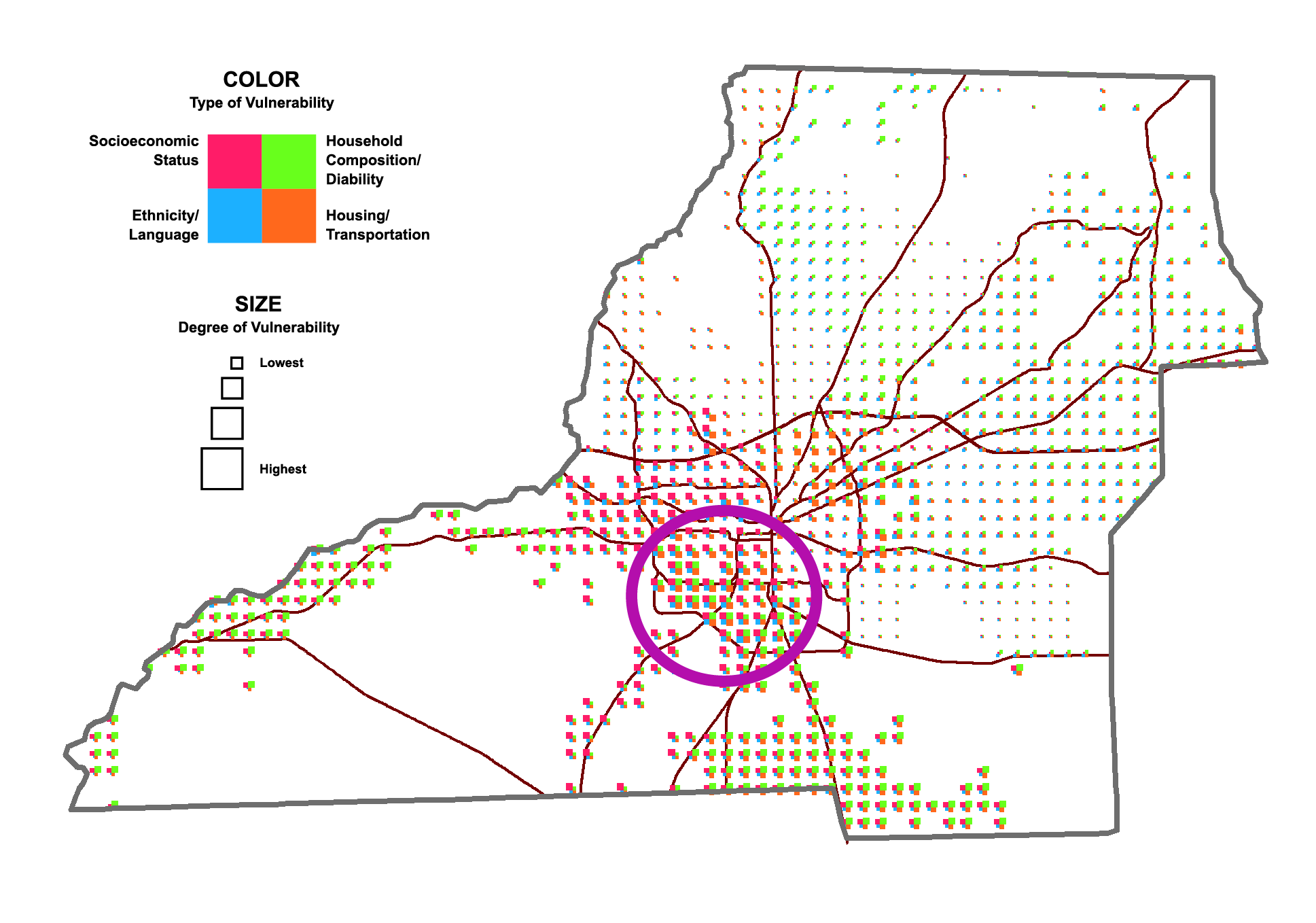 Figure 6. Glyphs of combinations of vulnerability themes (color) and their degrees of risk (classed square sizes).