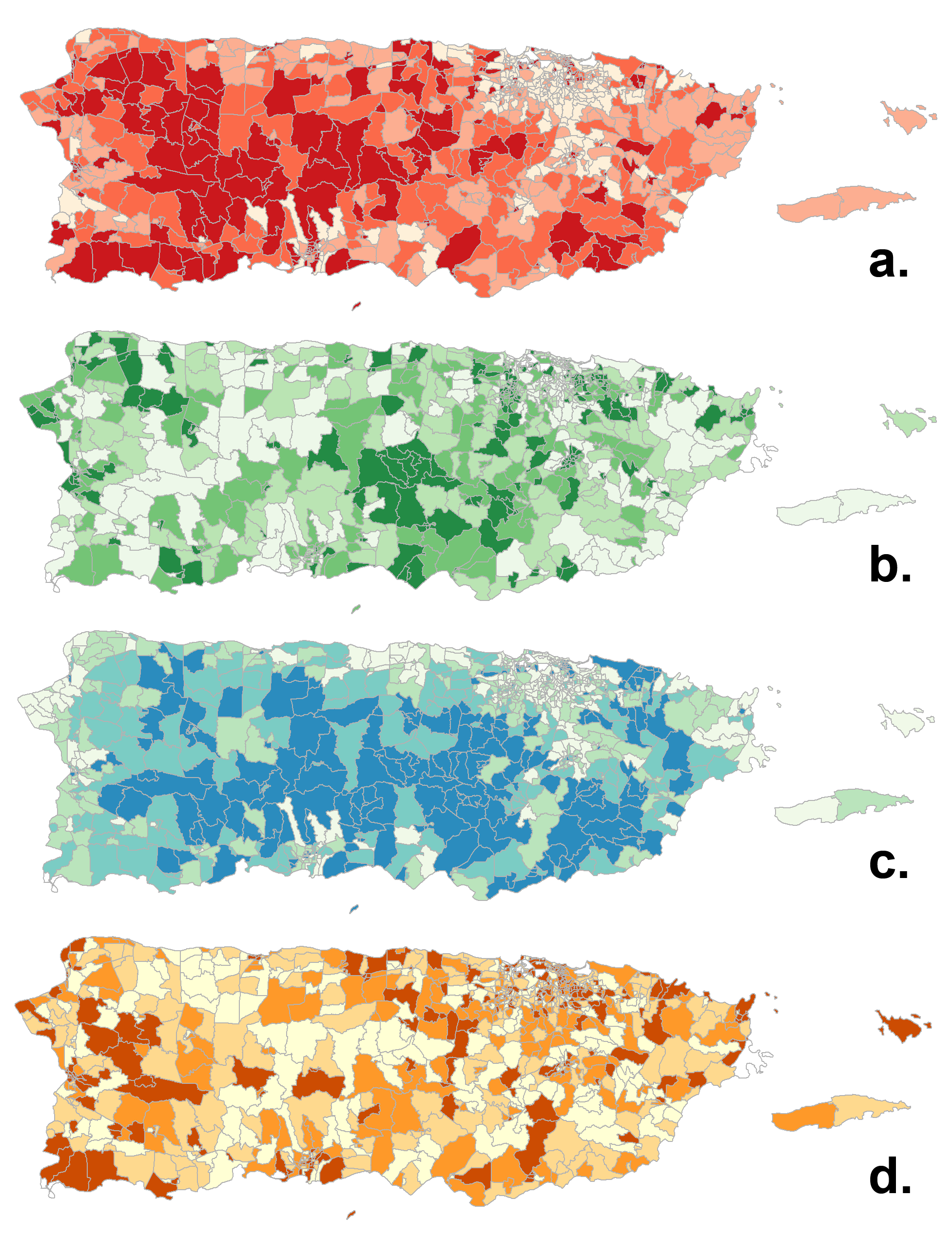 Figure 17. Univariate maps showing the four themes of 2016 social vulnerability for Puerto Rico. Darker colors represent higher vulnerability. a. Socioeconomic Status; b. Household Composition & Disability; c. Ethnicity & Language; d. Housing & Transportation.