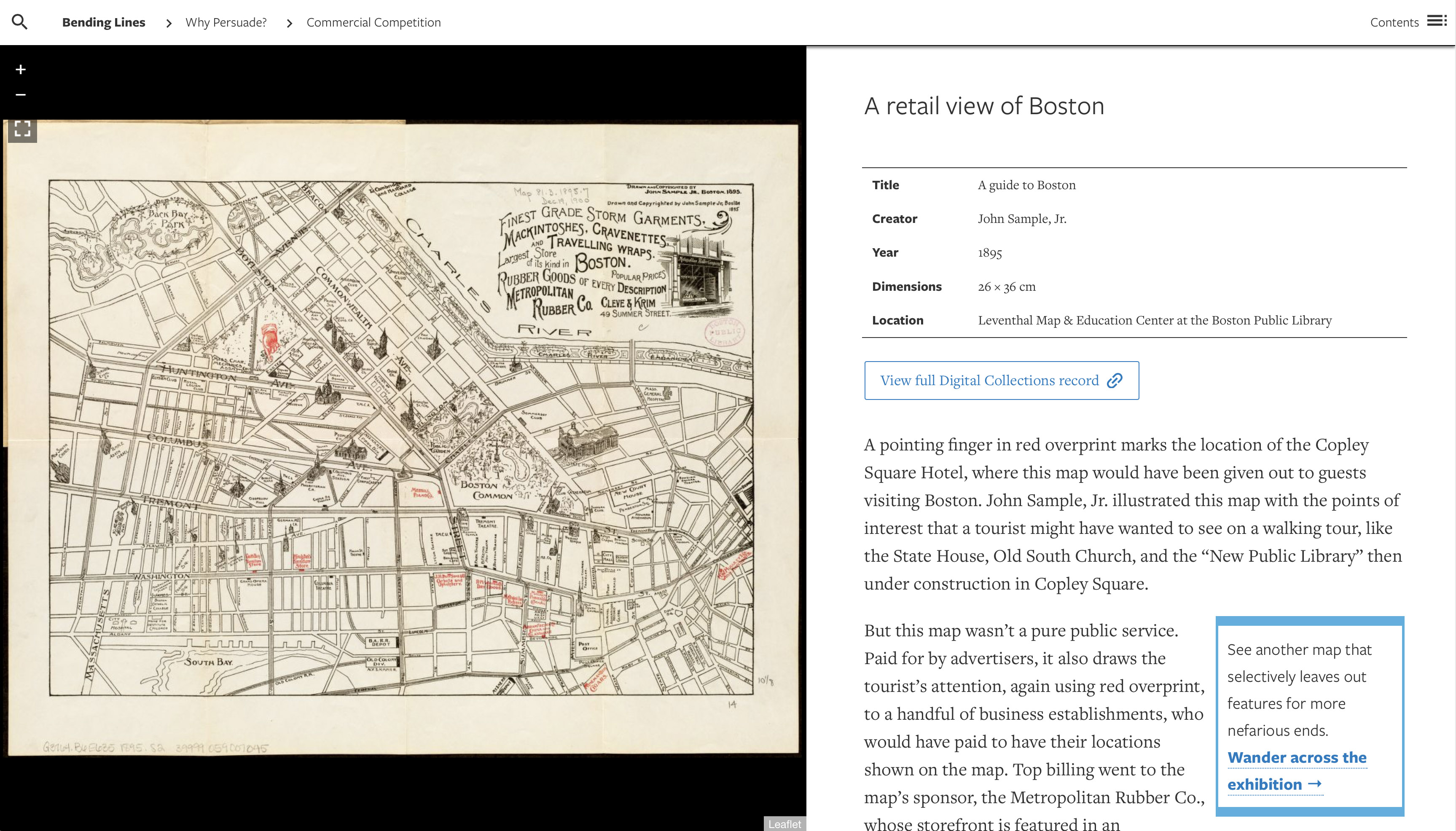 The digital exhibition—which includes, in addition to the exhibition material, bibliographic metadata for the objects, a scholarly references section, and links to each object’s authoritative copy on the LMEC or partner libraries’ digital repositories—is available at leventhalmap.org/digital-exhibitions/bending-lines.
