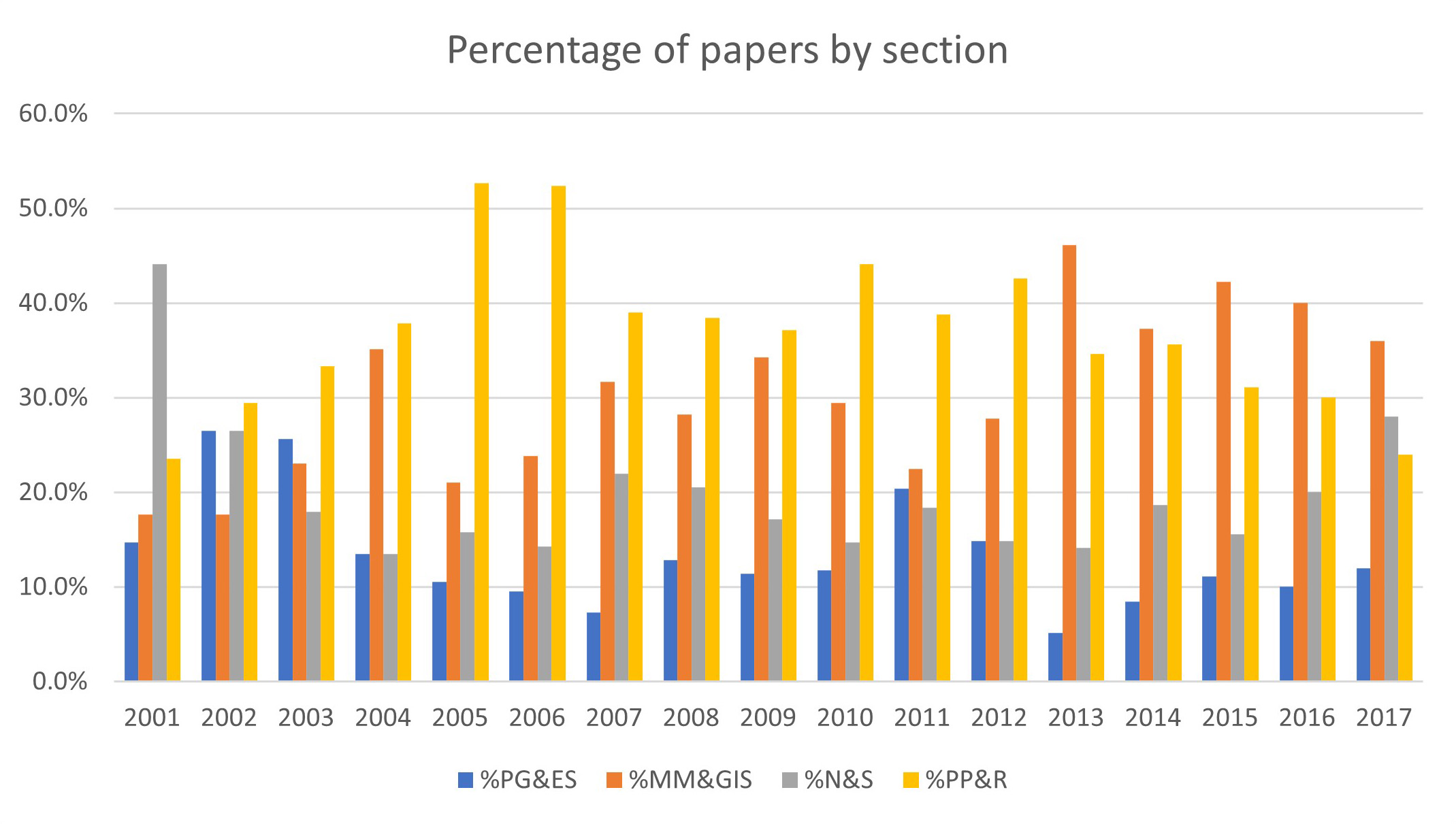 Figure 11. Chart illustrating the percentage of papers by section (2001–2017). Sections are: Physical Geography and Environmental Sciences (PG&ES); Methods, Models, and GIS (MM&GIS); Nature and Society (N&S); and People, Place, and Regions (PP&R). Special editions are excluded from this figure.