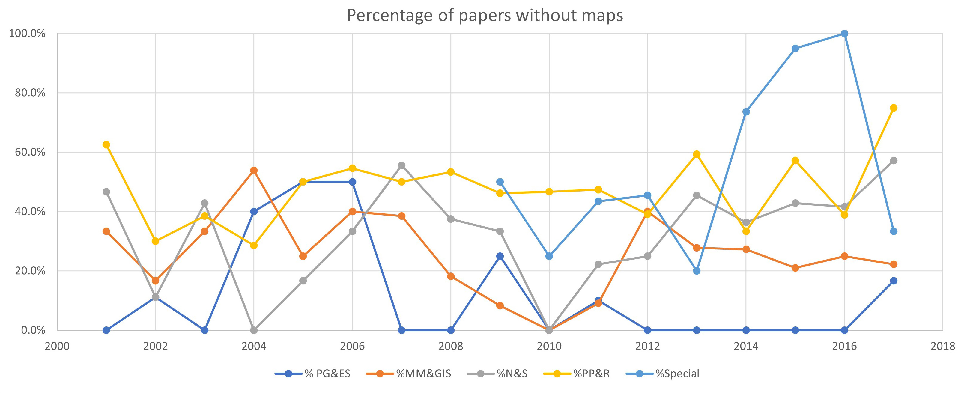 When examining the trends by section, some interesting patterns appear (Figure 12). Overall, PG&ES consistently had the lowest percentage of papers without maps—for ten of the 19 years, that percentage was zero. PP&R had the highest percentage of papers without maps at around 48%. Both MM&GIS (surprisingly) and N&S fell somewhere in between. Interestingly, 2010 was anomalous: PG&ES, N&S, and MM&GIS had maps in all of their papers, though overall, 22% of all papers published did not contain maps. The special editions (2009–2018) had relatively low percentages of papers with maps, comparable to PP&R, though more variable. Chi-square and Cramer’s V tests (53.7 and 19, respectively) were run on the numbers of papers with and without maps by section. This indicates that there is a significant relationship between the section and the presence or absence of maps.