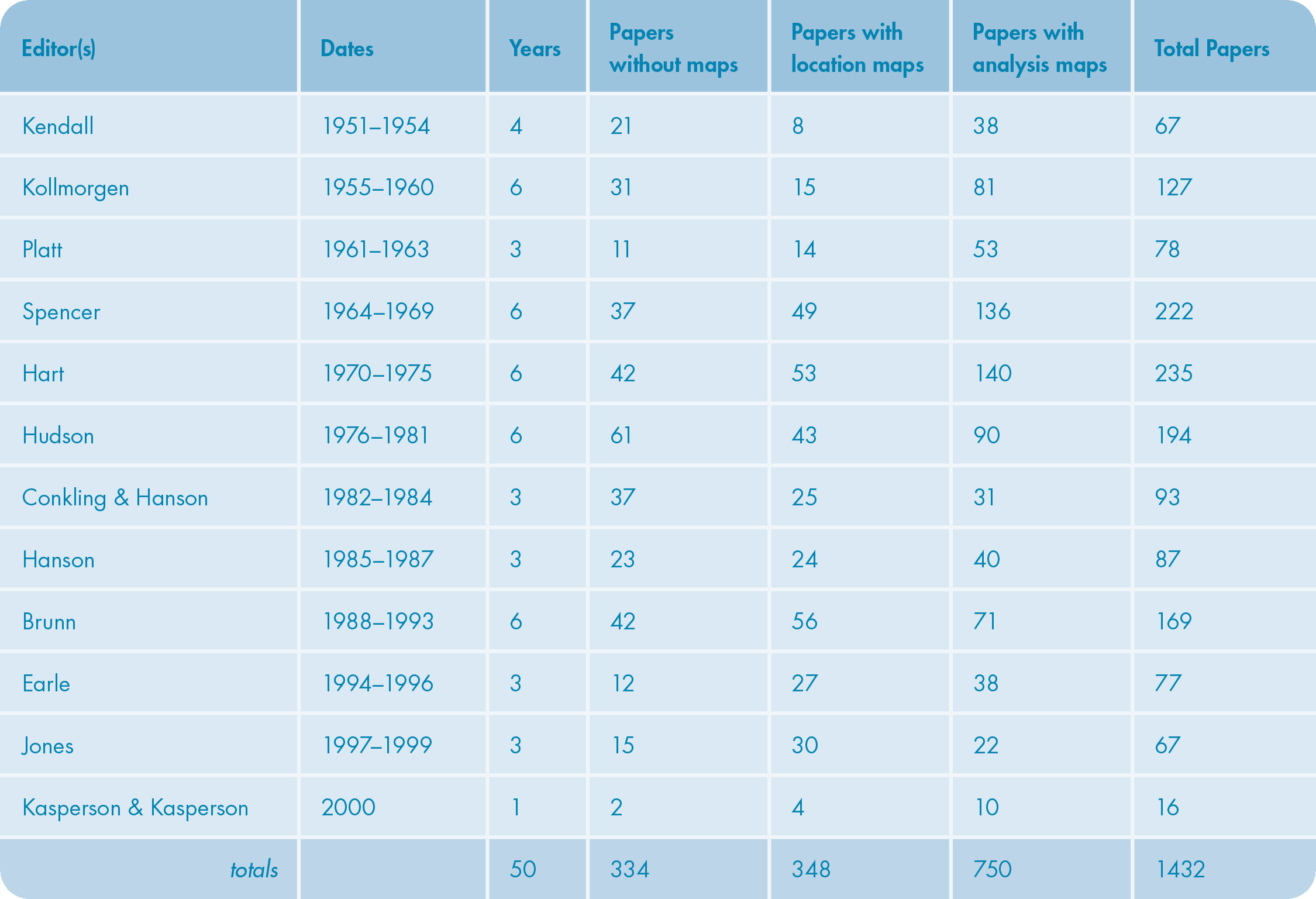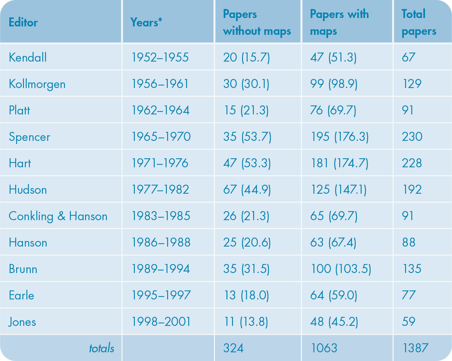The Annals had 12 different editors (or pairs of editors) during the years 1951 through 2000 (Table 1); their terms ranged from 1 to 6 years. The format of the journal changed in 2001, with each section now having separate editors, thereby reducing the overall impacts of individual editors. As a result, this analysis was not done post-2001. The distribution of papers by type is shown in Table 1, while Figure 10 illustrates the percentage of papers without maps by editor. As can be seen, this percentage varies from 12.5% (Kasperson & Kasperson) to 39.8% (Conkling & Hanson).