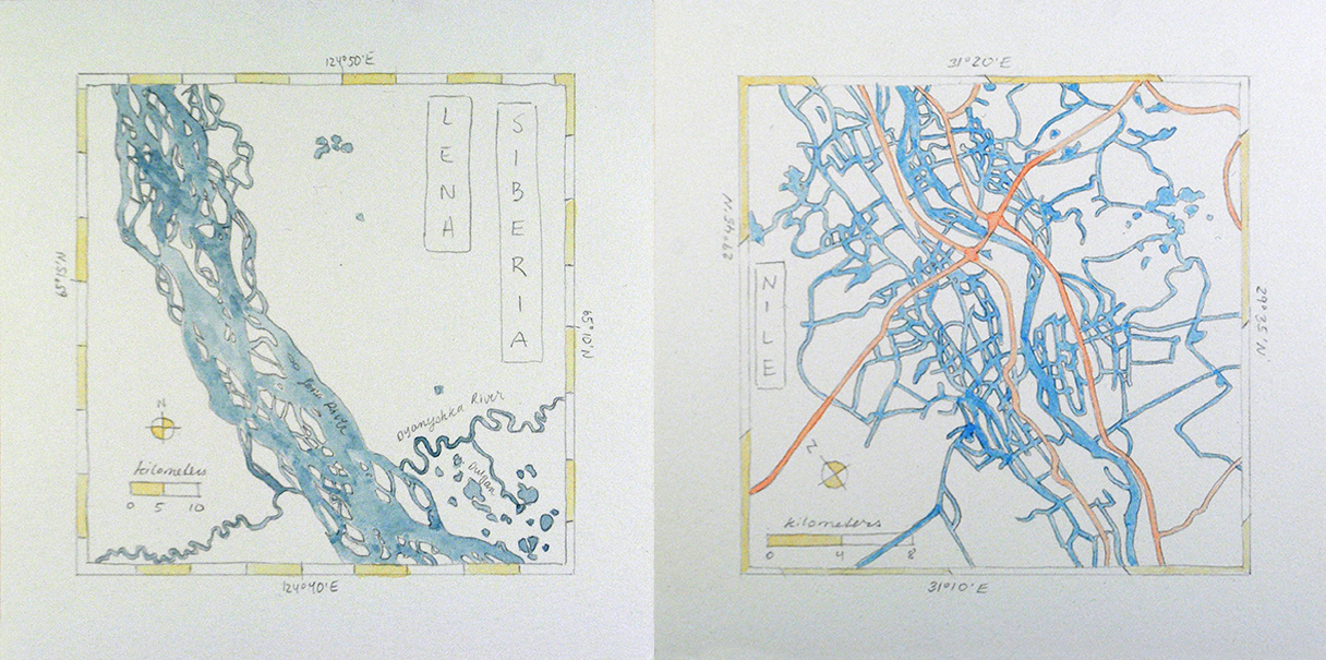 Drawing these maps led to many thoughts, observations, questions, and comparisons. Compare, for example, the wide loose braid of the Lena as it spreads over the taiga lowlands, to the artificial spreading of the Nile through a dense network of irrigation channels. Or an open crosshatch of highways in Ontario to an uncomfortably tight knot of converging roads in the mountains of Japan.