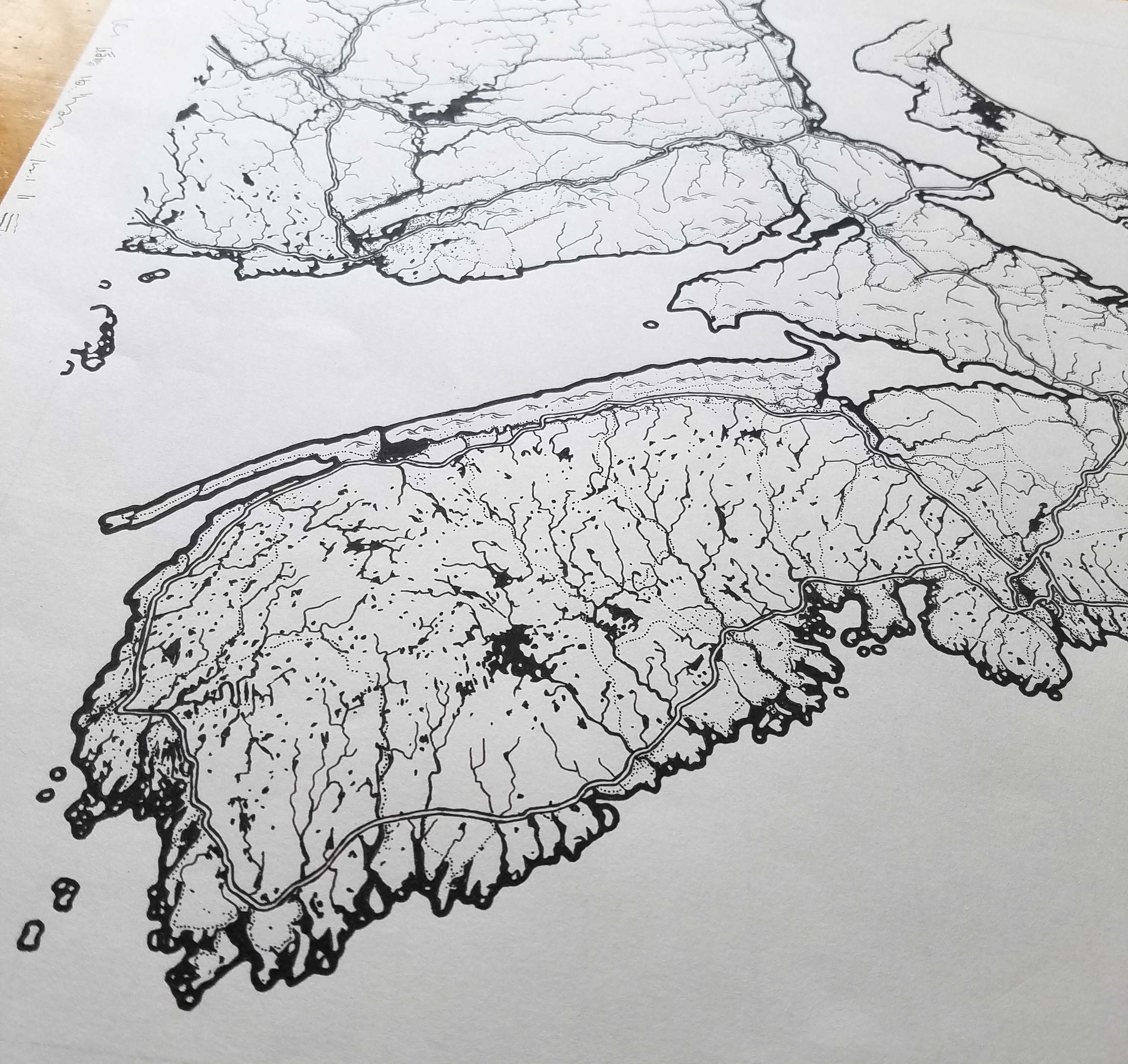 I have mentioned a few of the aesthetic benefits of mapping by hand. However, I believe that the greater benefit is the experience and knowledge gained by the cartographer during the long, slow process. When you draw with software, the entire layer appears at once, and you merely decide the symbol properties. When you draw by hand, you decide each mark, and this is where I experience the true delight of geography. Without drawing every mark I never would have reason to consider why a road is depicted in one reference but not another, how some rock barrens streak across a peninsula in a particular pattern, how settlement patterns on one side of a border differ from those on another, or even just the loveliness of the shape of an unnamed lake.