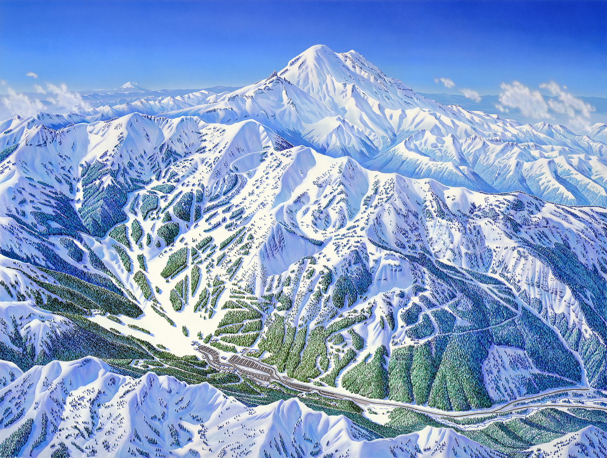 Yeah, there are. I work with the airbrush on snowy terrain, so it’s a pretty simple process. With my early summer maps, I tried with the airbrush but it was so unrealistic, so I turned to the brush entirely. I didn’t feel my brush rendering was as effective as the airbrush, but I did develop it into a pretty nice style. The latest ones are the Blackcomb and Whistler hiking maps. I was really happy with those. It’s maybe a sketchier style, but basically, you need to show where there’s grass, brush, rock, or dirt, so it does become quite more involved in summer and fall views. In my fall views, I’ve always had a problem showing the trees as they are. The Okemo autumn portion is probably my best technique on that.