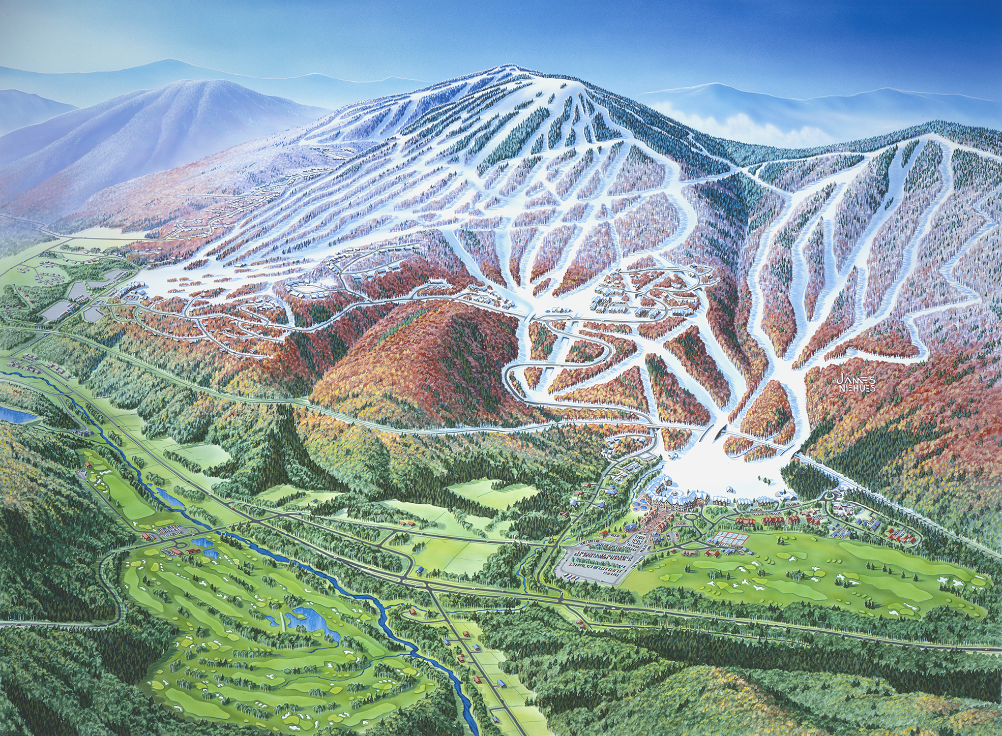 Yeah, and I always thought that would be the way to do it because that’s the way the skier’s going. The only problem with it is that the runs are going up-page. It’s just hard to relate to it. Plus, what they’re really interested in is the base area. All the important ingredients of the resort are in the distance instead of up close. The only one I did was Sunday River, for Snow Country Magazine. I thought if there’s any one that will work, it would be that one. I really was not happy with the result although it came out to be an interesting illustration.