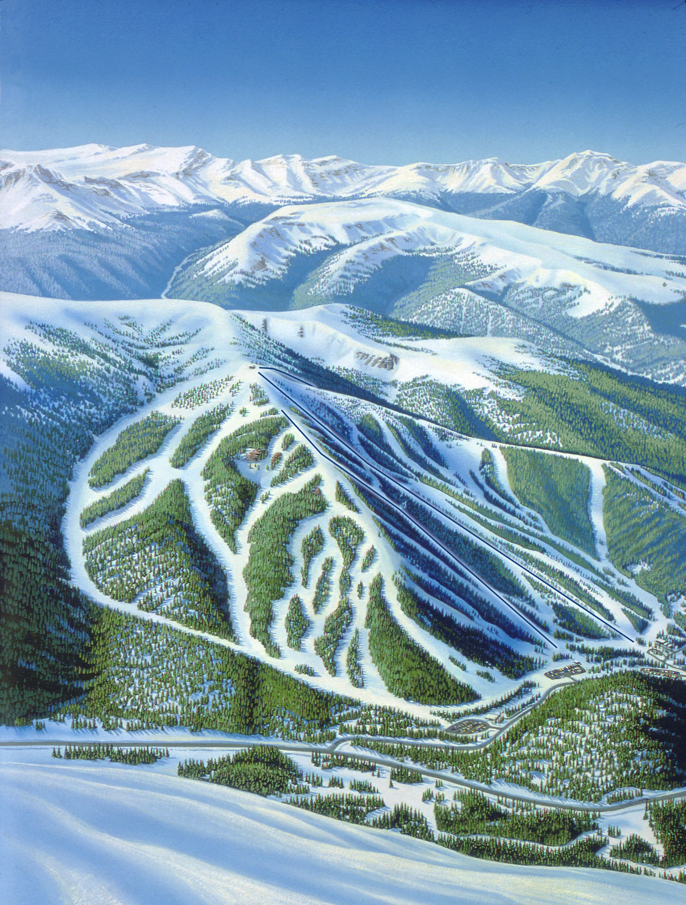Certainly to show the mountain range beyond, I diminish the contrast and detail. To distinguish the height of the mountain, I’ll start with the top trees being snow-covered, and as you go down they get greener. Of course, aerial photographs are blue; it’s just monochromatic from the air. Hal Shelton had always indicated to me that you paint it as you ski it, not as you work from your aerial photographs, so that helped in my early development.