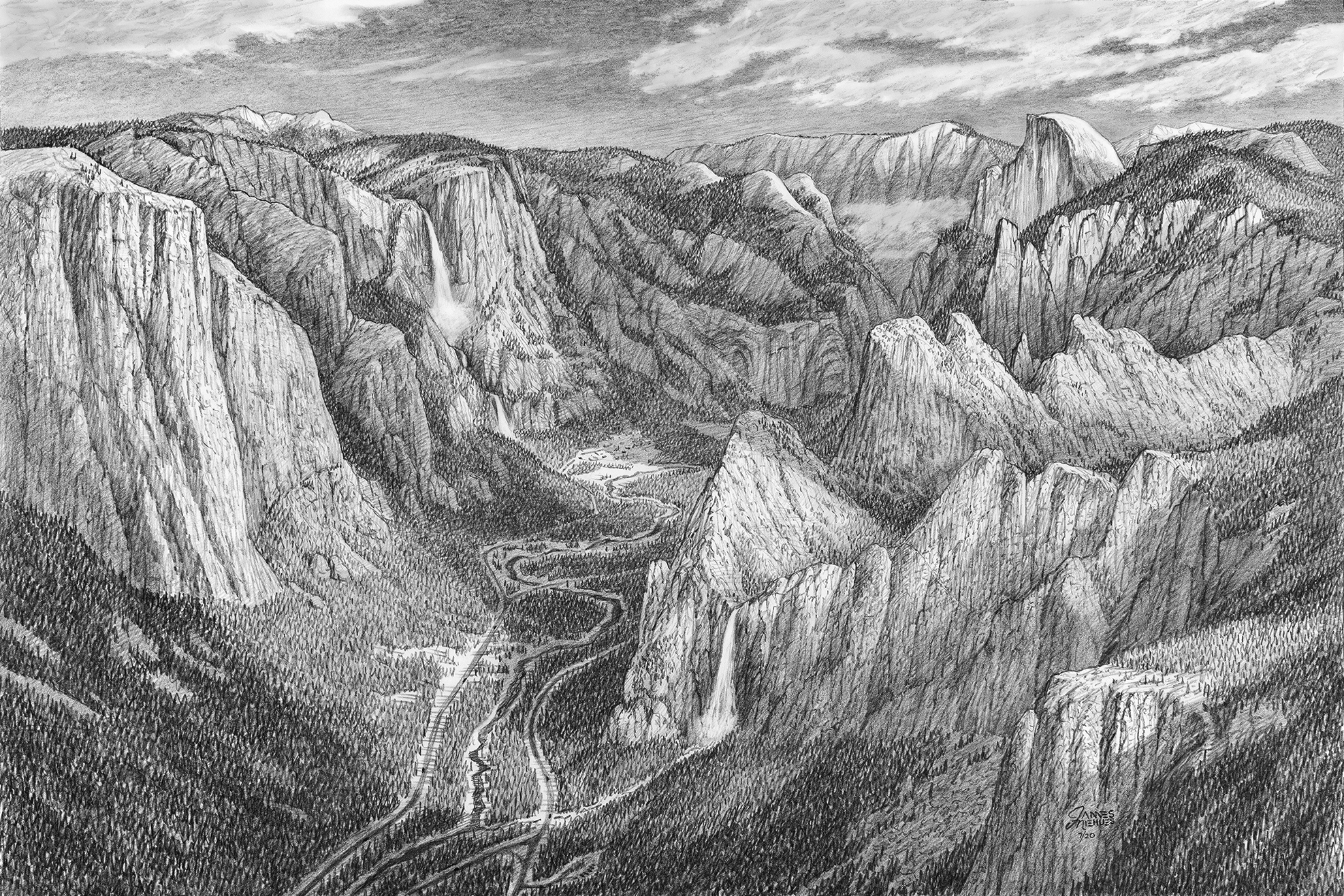 Let’s take Yosemite Valley. The most photographed view in the park is the tunnel view, with Bridal Veil Falls on the right and El Capitan on the left. I’ve flown that area, and I looked at my aerials and thought “You know, I could show the whole valley and include Yosemite Falls, show more of Half Dome, show Royal Arch, and the spires that are on the backside of Bridal Veil Falls, if I did a little manipulating.” In my aerials you can’t even see what I have sketched; Yosemite Falls is quite hidden by the Three Brothers. So, what I had to do was diminish the Three Brothers a little bit, and pull around Yosemite Falls so that it shows, and then I thought, “Oh the village is right down there so I’ll put in the village”. So, I peel away some of those tall trees enough to show the village and roads.