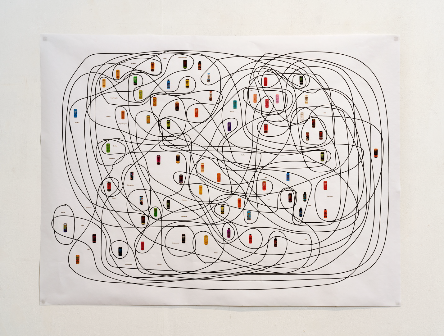 My most recent and ongoing body of work is a multimedia exploration of masculinity by way of Monster Energy. This exploration began with a large print titled Monster Taxonomy. This work was created to look like a diagram or a map that could be read and deciphered. Images of each of the distinctive cans [of] the myriad flavors of Monster Energy drinks are scattered over the page. There seem to be groups and clusters of containers, their proximity implying relation—this being Waldo Tobler’s so-called First Law of Geography, and one of the fundamental assumptions used in all spatial analysis. It states that “everything is related to everything else, but near things are more related than distant things” (Tobler 1970, 236). Overlaid on the constellation of cans is a tangle of looping lines that further seem to group cans that are sometimes quite widely separated, implying a different clustering, based on some criteria other than spatial proximity. The many grouping lines overlap, and blend together as they are not differentiated by any symbol dimensions and can be almost impossible to sort out—especially as their compass expands beyond a few cans. Text featuring terms associated with sexual and gender identity—some more mainstream than others—at first appear to be labels for either the spatial clusters or the groups enclosed by the outlined polygons, but these, too, soon disappoint the map reader: there seems to be no rhyme nor reason to any of it. The ‘map’ refuses to be read.