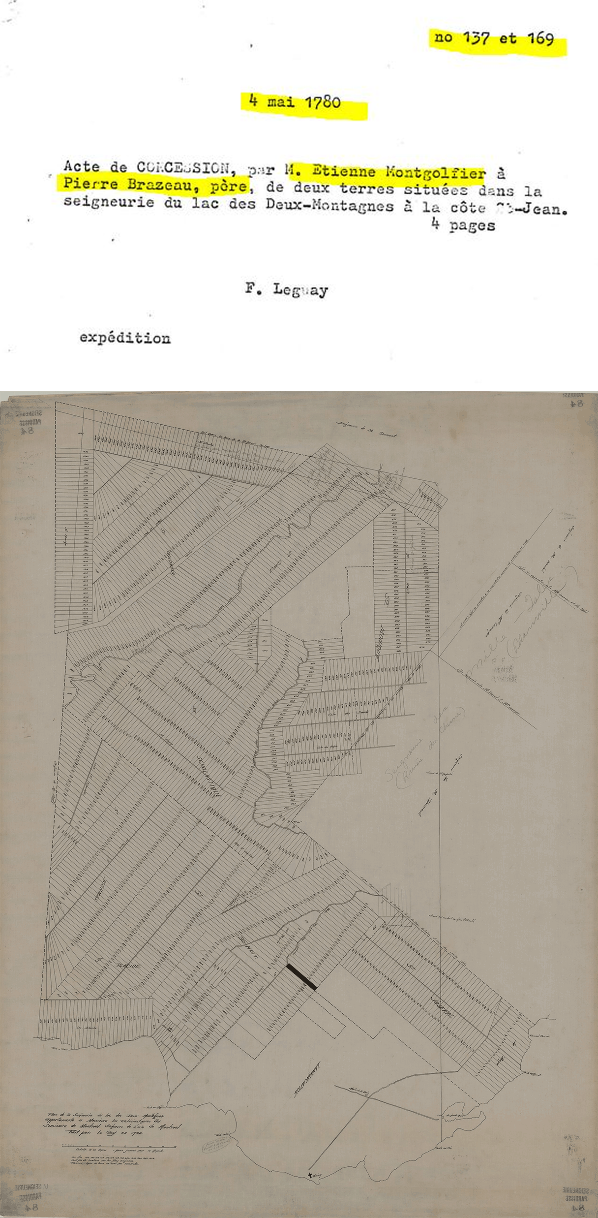 Figure 5. The example above shows the six lots attributed to Pierre Brazeau, lot 137 among them. The example below shows the 243 lots the Sulpician priest Etienne Montgolfier distributed to settlers from 1780 to 1791.