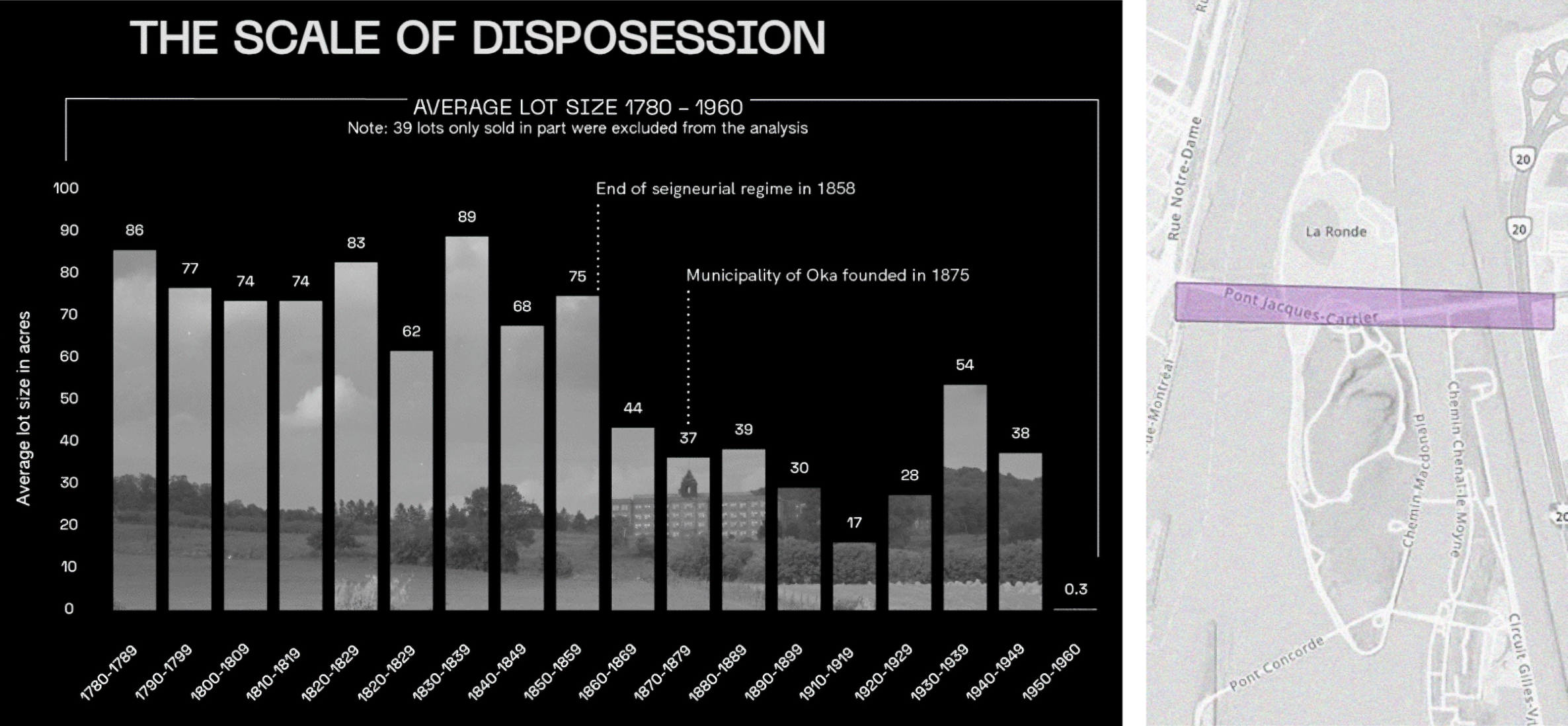 Figure 4. By superimposing lot 137 on the Jacques Cartier bridge in Montréal, we are able to grasp the scope of dispossession; how much land was attributed to just one man like Pierre Brazeau. The graph contextualizes the sizes of the lots within the seigneurial regime. By using both visualizations we can better understand how the Seigneurie rapidly spread across the land.