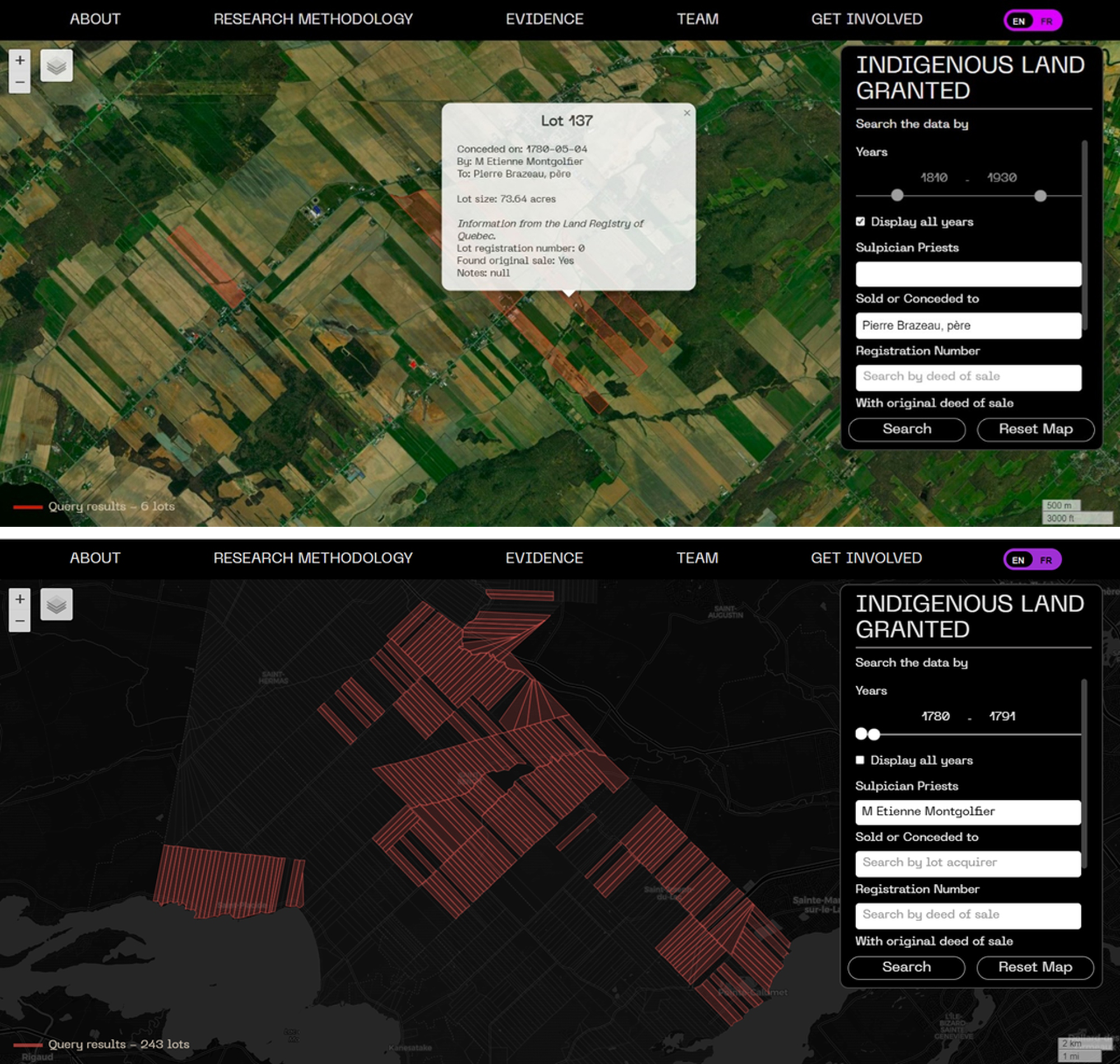 By clicking “view full map” users are prompted to freely explore the archival dataset. By formulating a query to identify the lots owned by Pierre Brazeau across the entire time scale of the dataset, we can see that lot 137 was one of six lots Brazeau had acquired. If I change my query to include Etienne Montgolfier, the Sulpician priest responsible for granting land to Brazeau, the map sheds light on Montgolfier’s extensive power and influence in the region throughout his tenure as the superior of the Sulpicians in Montréal (1759–1791). Montgolfier granted 243 lots of Indigenous land over the course of 32 years (Figure 5). Switching to a satellite base map reveals what is on these lots today. The cadastre lines from the eighteenth century still appear, etched onto the land like scars. The lots have not moved or changed shape; they have merely been subdivided.