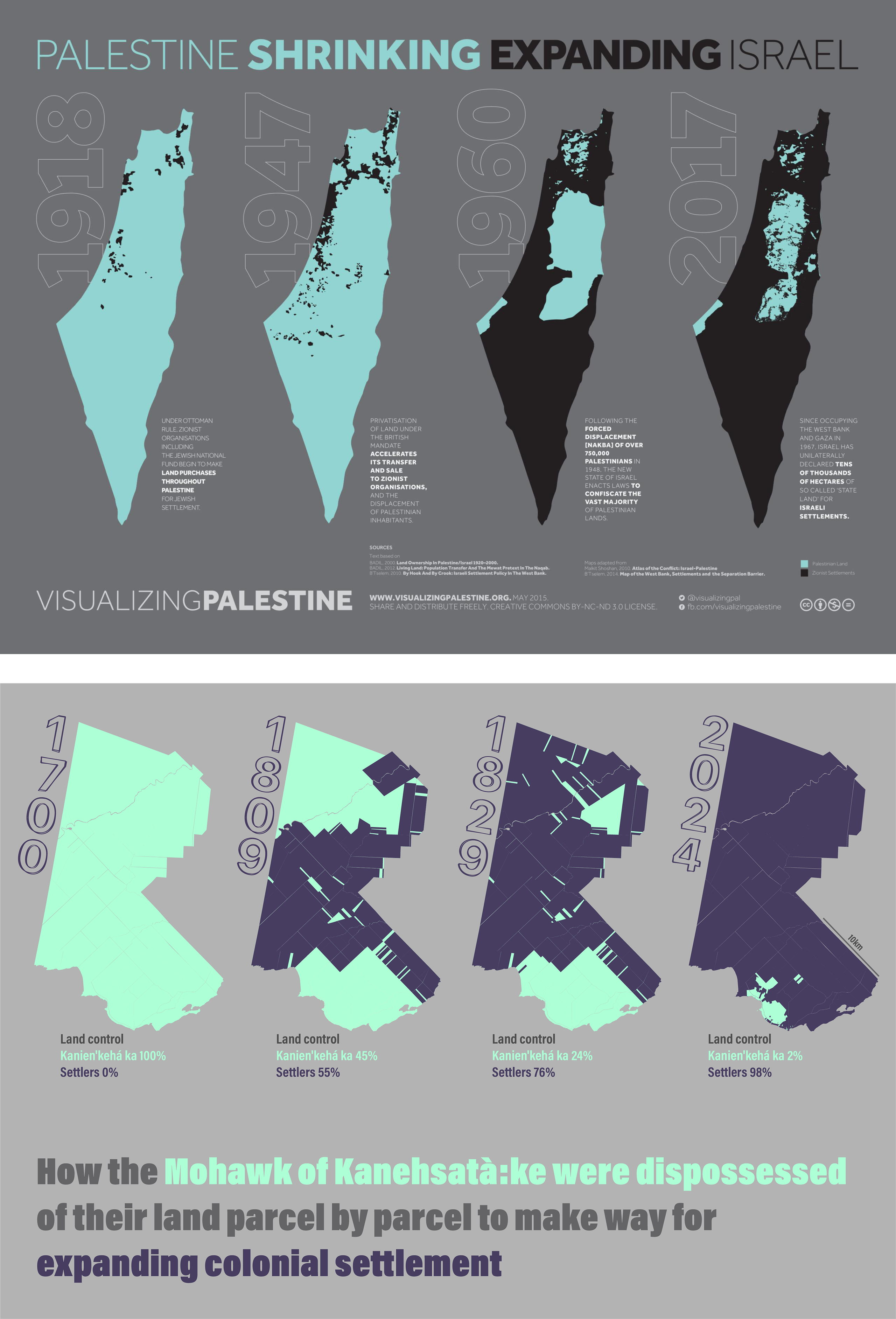 We also discussed integrating the map in the contemporary social media information-scape. Recognizing the competitive nature of social media attention, the media strategist suggested rendering the data in the Kanehsatà:ke Land Defense mapping project in formats that draw parallels with other well-known concerns in the news. They pointed out that “some of the most powerful content I’ve seen go around us, specifically from Indigenous folks in Canada is talking about the parallels between Palestine and their experience.” A map emphasizing the shrinking Kanehsata’kehró:non land base would be more likely taken up in current global discussions and alliances if it is designed to be in dialog with other maps, in this case maps of Palestinian land dispossession from 1947 to present. The objective was to facilitate the Kanehsatà:ke Land Defense mapping project’s accessibility, encouraging people to share and interact with it. “The key to help sharing,” the media strategist explained, “is to give people something easy for them to post.” To achieve this, I converted the online map to a static image which could be easily shared, and simplified the visual representation to include only two colors representing settler lands and Indigenous lands, mimicking a very popular shrinking map of Palestine (Figure 6).