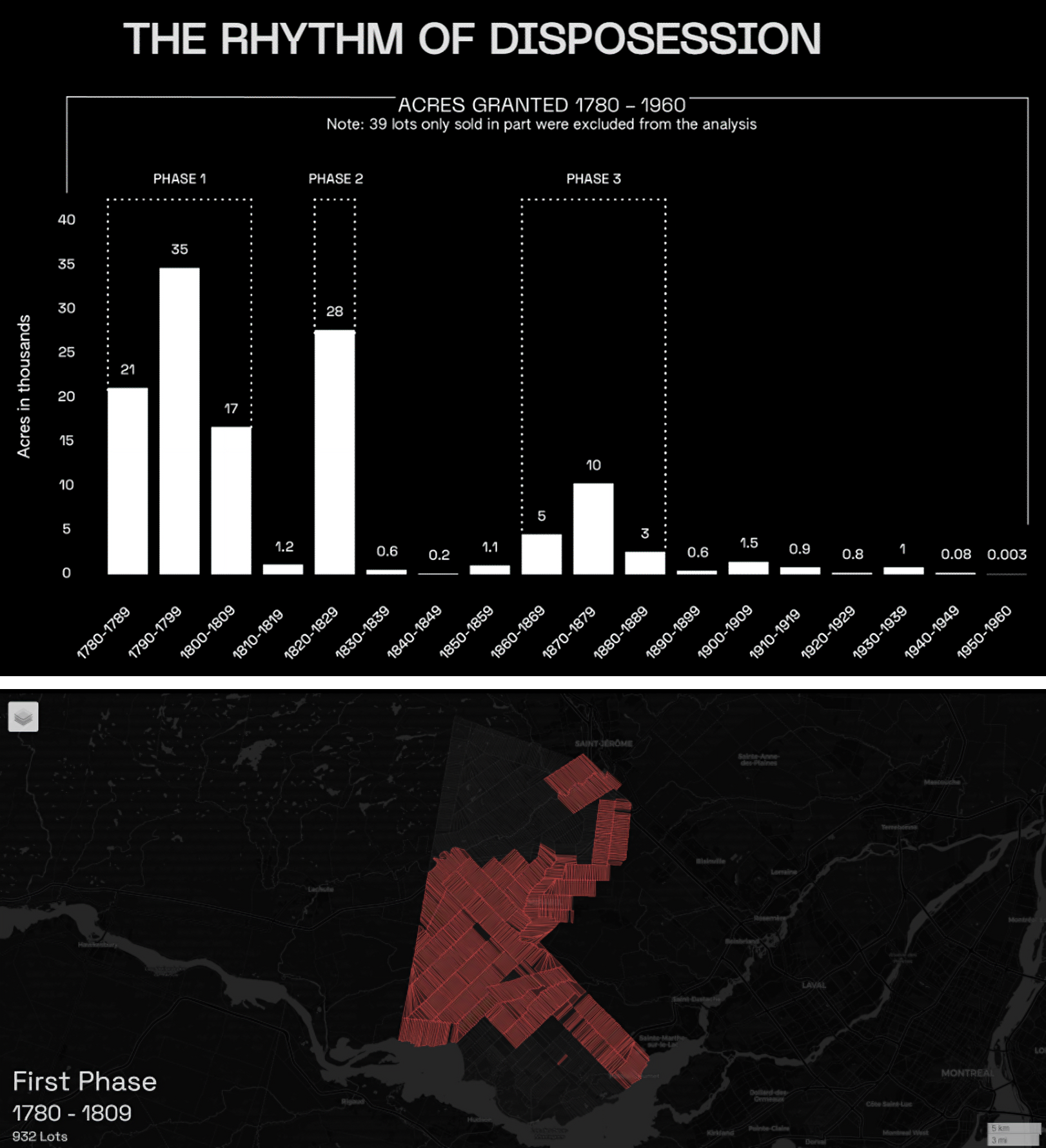 Pierre Brazeau was amongst the first European settlers to be granted land by the Sulpicians in the Seigneurie du Lac-des-Deux-Montagnes. By tracking the rhythm of dispossession (how fast lots were granted to settlers), we learn that within the first decade of settlement, 21,000 acres of land were taken from the Kanehsata’kehró:non (Figure 3). Lot 137 was among them. We can also see that land dispossession did not occur uniformly over time. Instead, settlement happened in sharp bursts, each lasting approximately between 10 and 30 years (Denieul-Pinsky 2024). These bursts can be identified across three distinct phases in the historical record (Figure 3).