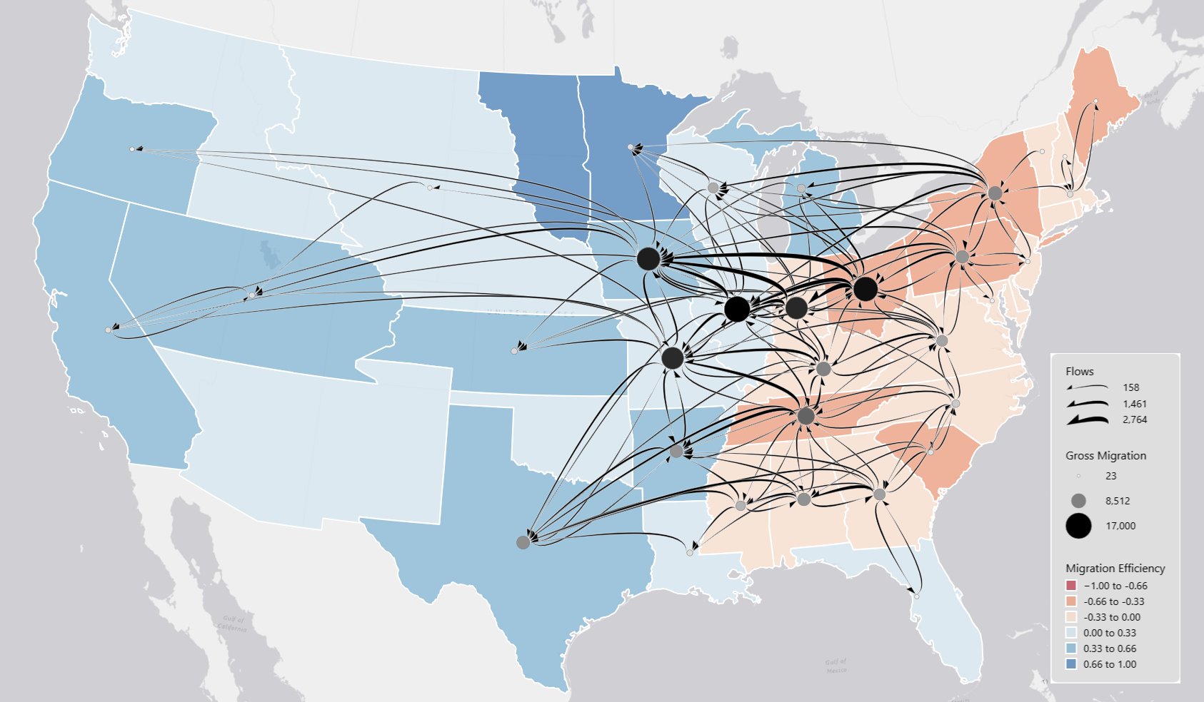 Figure 1 illustrates a child-ladder migration flow map from 1850 to 1860 generated via flowmapper.org (Koylu et al. 2023). The curved flow lines illustrate the total number of families that moved between pairs of states; the point (node) symbols illustrate the gross volume of flows per state. Additionally, the choropleth base map represents migration efficiency, which is calculated by dividing the net flow of migration (the difference between the total inflow and outflow of migrants) by the sum of the total inflow and outflow. During this period, the child-ladder migration flows show a significant movement from east to west, with eastern states experiencing population declines and western states seeing increases. Major hubs of migration were identified in Ohio, Indiana, Illinois, Iowa, and Missouri.