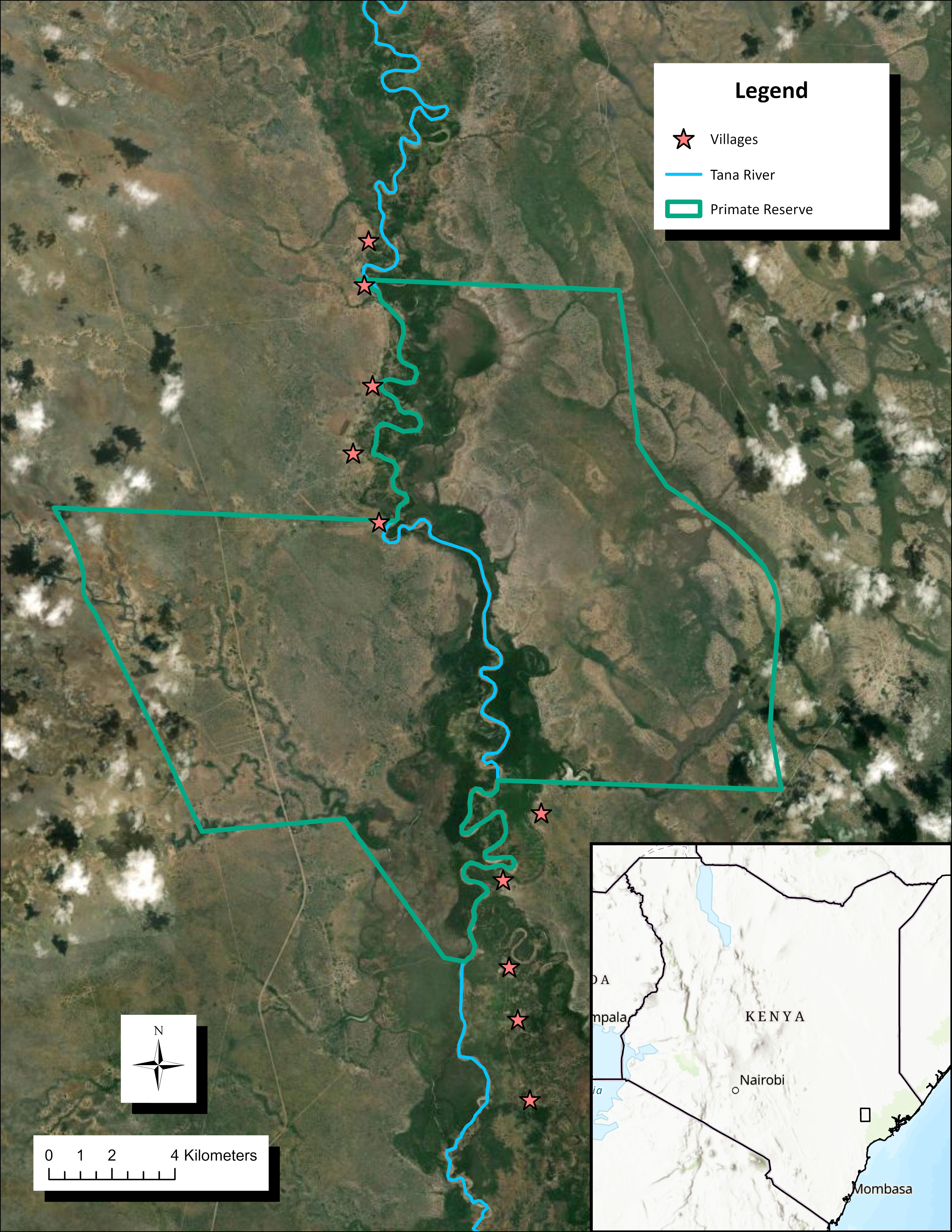 Figure 1. The area of interest is in the lower Tana River region, shown by the rectangle in the inset map. Selected village locations (shown with red stars), the Tana River Primate National Reserve (TRPNR) boundary (shown with a green line), and the Tana River (shown in blue) are depicted over recent satellite imagery. Map created by Susan Tang.