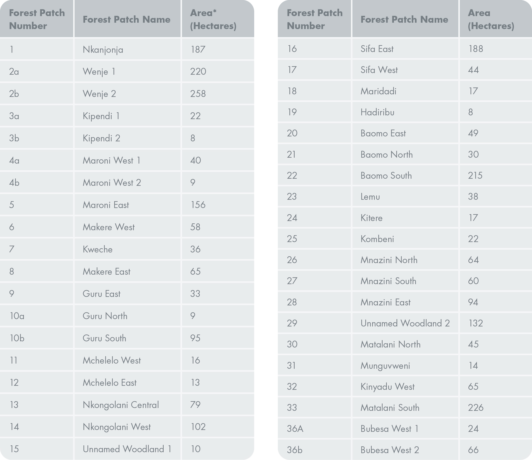 Table 1. Selected forest patches and their published names. Forest patches are identified by their numbers and corresponding published names, as well as the forest area in hectares. The table is adapted from Figure 3 in Butynski and Mwangi (1994), and it references Figure 2 below. *Areas calculated using polygon geometry in GIS software.