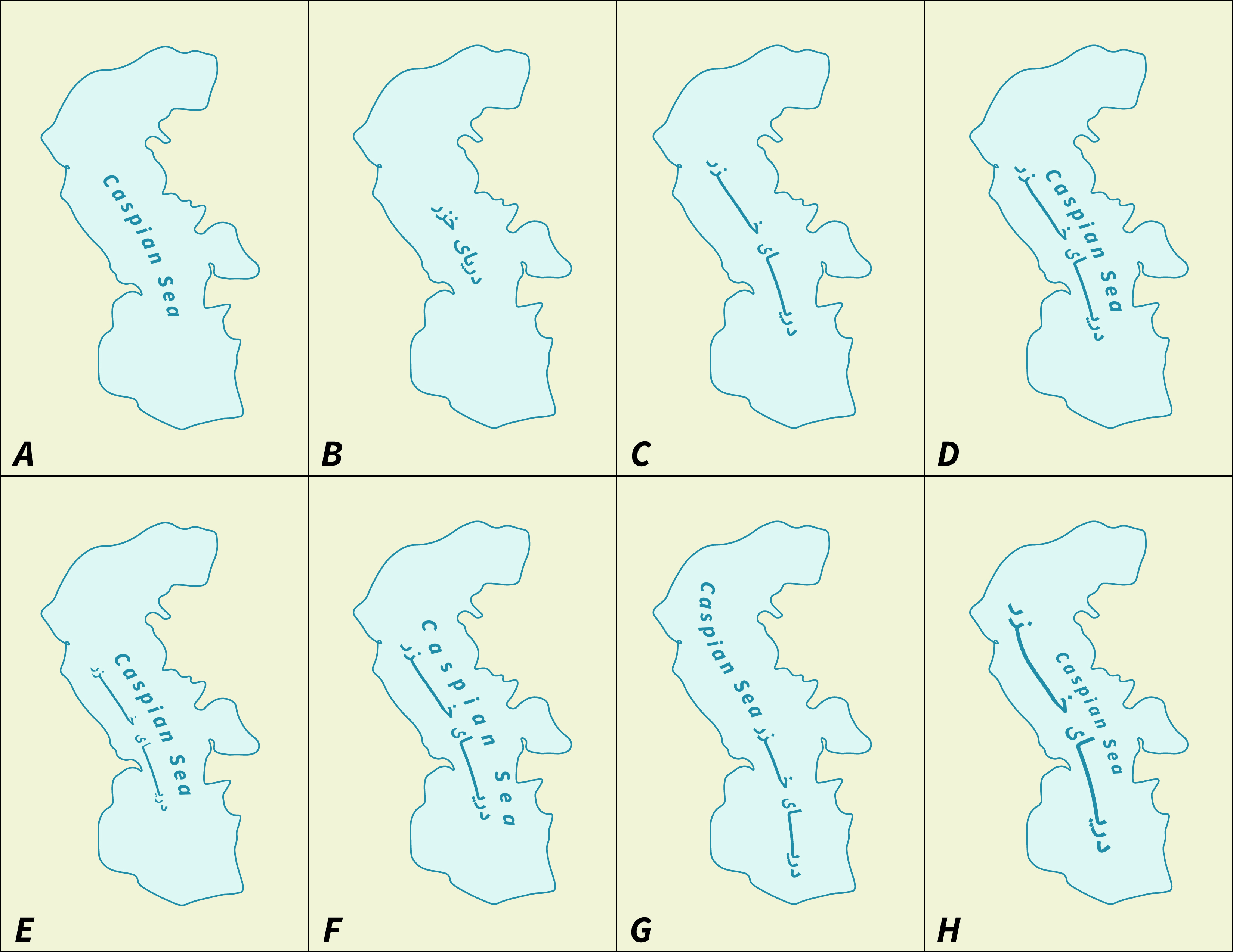 Figure 7. Variations on labeling the Caspian Sea. (A) Label in English with tracking applied, (B) label in Persian, (C) label in Persian with two kashidas, (D) label in Persian with kashidas and in English. The bottom row shows map label placement in both scripts but with a different label placement strategy in each example.