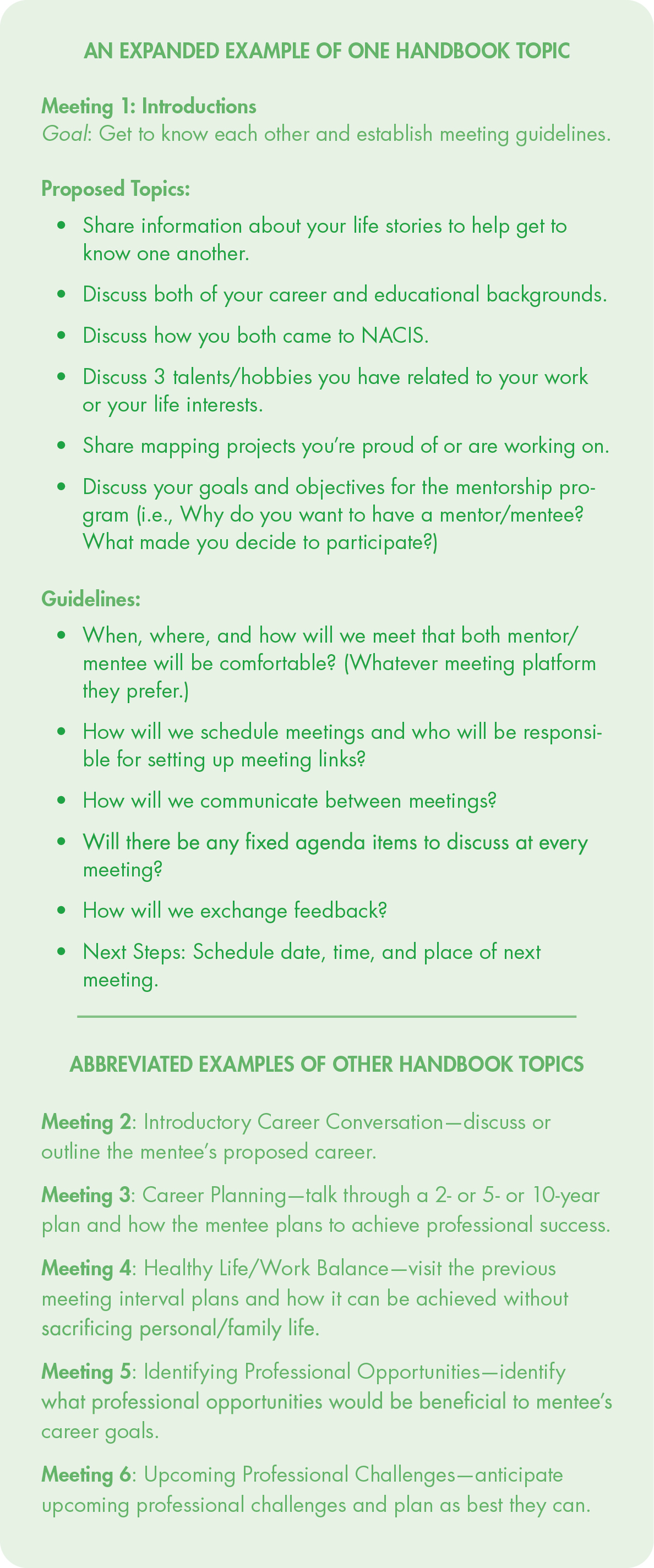 Tip 3: Documents are scaffolding for the mentorship relationship, not a full curriculum. We knew the field of cartography was vast, with many subfields and paths, and so in order to make the program relevant to all of these variations, we’d have to be flexible in our documents. The program could not follow a strict structure in the way that a degree program outlines specific courses. We also knew we’d have folks who had not participated in a mentoring program before and might like guidance on how mentoring works, in general. Our documents initially included: