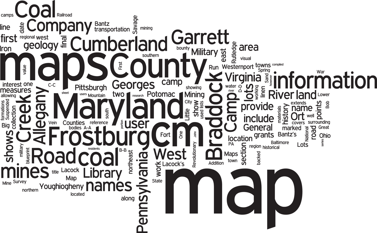 Although these three coal mine maps show the same basic information, with little variation on presentation, each map lends additional details and information to increase the users’ information about the coal region and adds to the history of the coal mining region of Allegany and Garrett Counties.