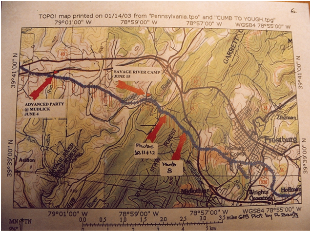 Figure 1. Bantz Map of Braddock Road from Frostburg, Maryland west to Savage River Camp and Advanced Party at Mudlick.