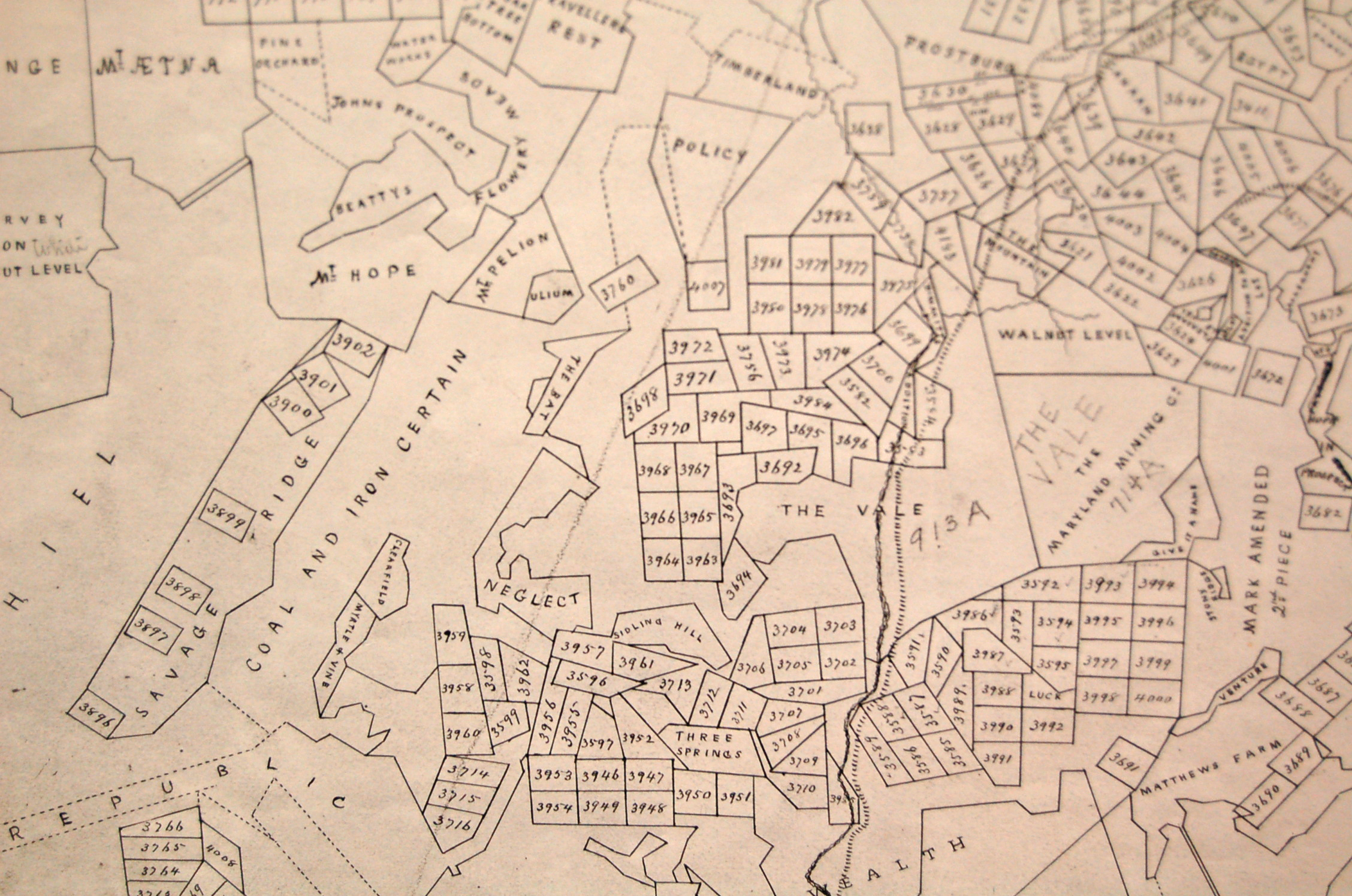 Figure 2. Detail of the “Map of the Military Lots, Tracts in Allegany County, Maryland West of Cumberland.” Photo by V. Williams.