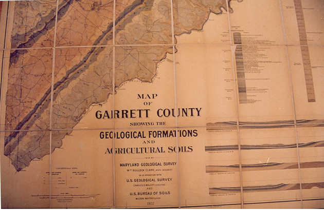 Many geologic maps of Garrett County, Maryland have been produced over the years, showing topography, geologic formations, physiology, and forest/ vegetation. The condition of these maps in the Lewis J. Ort Library collection ranges from pristine to dog-eared, laminated, encapsulated, backed with linen, and more.