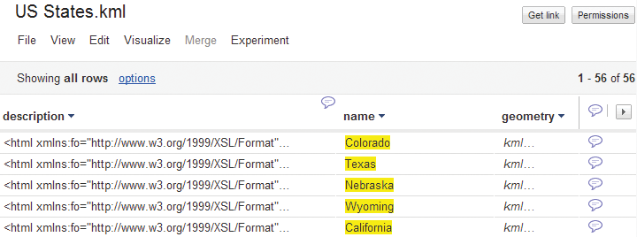 Figure 1. The imported KML file is displayed in a Google Fusion Table. The three column headings are the main subsections of the KML file. The description column contains the HTML code for map display format and the attribute table data. The name column contains the map’s name from the shapefile. The geometry column holds the KML code for the points that comprise the map from the shapefile. Notice the number of entries is 56, for the 56 polygons that correspond to the 56 states and territories.