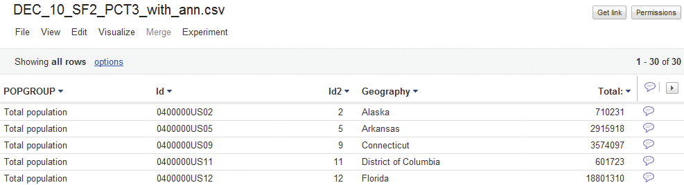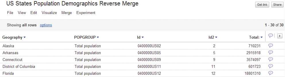 Figure 2. The uploaded demographic data file in Google Fusion Tables. Note the number of entries is equal to 30.