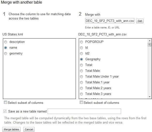 There are two parameters in the merge operation that require explanation. The merging operation performed by Google Fusion Tables is “computed dynamically,” meaning the data in the merged table will be updated if the data in the original tables is changed. The note in the dialog box also states if the data in the merged table is changed, the data in the original tables will be changed as well. This is a very useful function if the user is aware that this is happening. The user could merge tables, believing the original tables and the merged table are separate and distinct entities. However, changing one table will affect the data in the other table, as stated in the merge dialog box. Without understanding this, the user might inadvertently change data in both tables.
