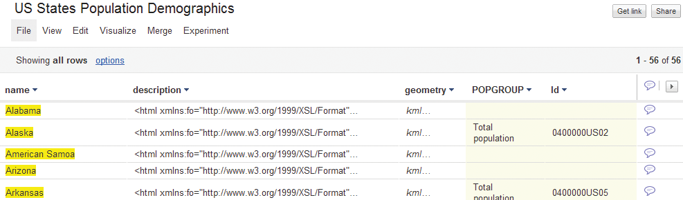 Figure 4. Merged results of selected KML file with demographic data file merged to it. Notice that all states, territories and districts in the US are represented by the number of rows of data in the table (56). In this figure, Alabama, American Samoa, and Arizona did not have corresponding entries in the demographic data table. Those maps are still in the table due to the order of the merge (KML first).