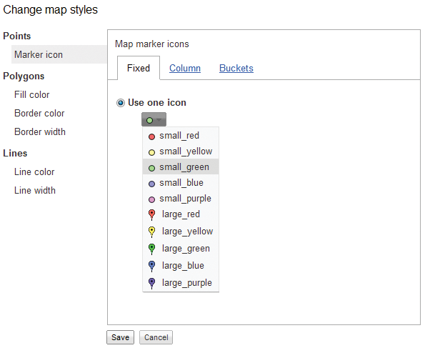Points on a map are identified as markers. The default marker is the standard upside down tear drop, although Fusion Tables offers approximately 200 additional markers. Figure 2 shows how the user can change the color of the icon under the fixed tab. The fixed tab means that the user wishes to set all of the points to be equal value. The column tab is used to provide a specification for each row’s display in one of the table’s data columns. This option provides the most specific control over the appearance of features on the map. The Buckets tab is used to classify the data. If the user wishes to represent multiple classes of data, he or she can change the color of each class to represent the data more accurately.
