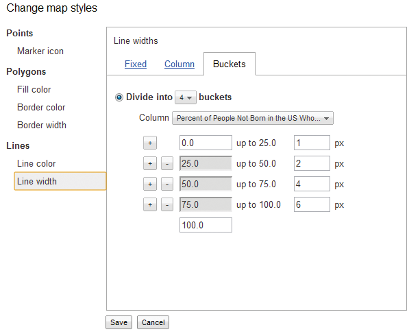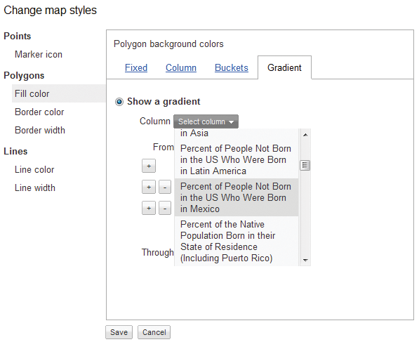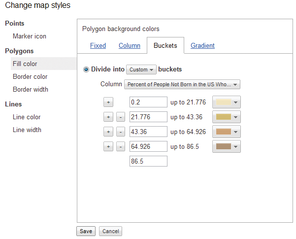 Fusion Tables can also handle polygons. Similar to points, a polygon can be modified with the “Fixed,” “Column,” and “Buckets” functions. “Buckets” control the shading of the polygons. In Figure 6, “Buckets” is used to specify a range of values to assign to each color. Style is assigned to each row based on the value in a numeric data column.