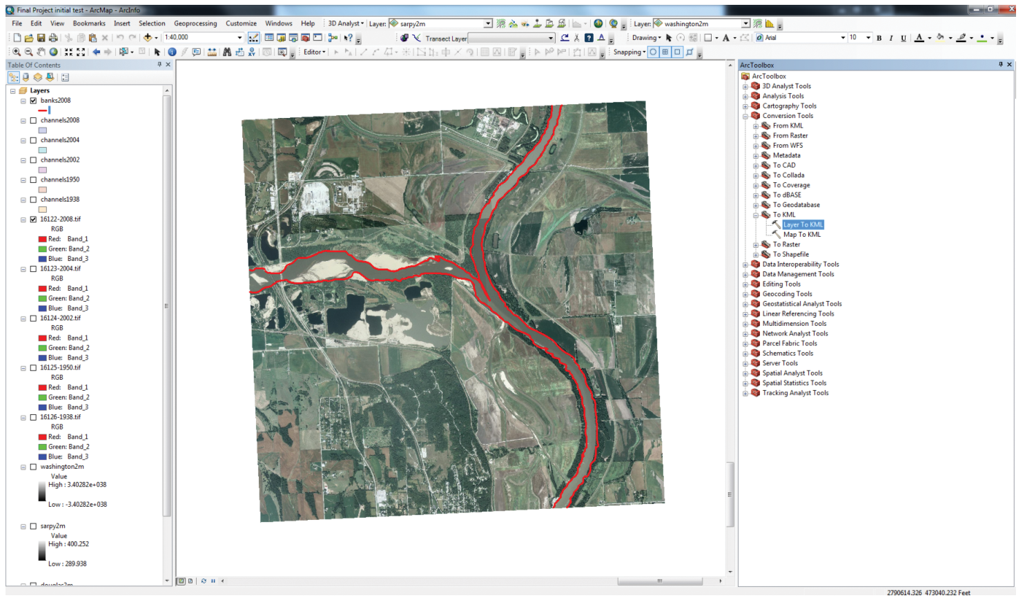 Historic georeferenced aerial photographs were obtained as .tif files from http://www.historicaerials.com/aerials. php?op=home. These files were imported to ArcMap 10.0 (Figure 1). While one can overlay images in Google Earth and extract the KML code, ArcMap was chosen to allow the tracing of stream locations. Using ArcMap editing tools, the outer margins of the stream channels were traced from separate years for the Platte and Missouri Rivers near Plattsmouth, Nebraska, and were digitized as lines on separate layers.