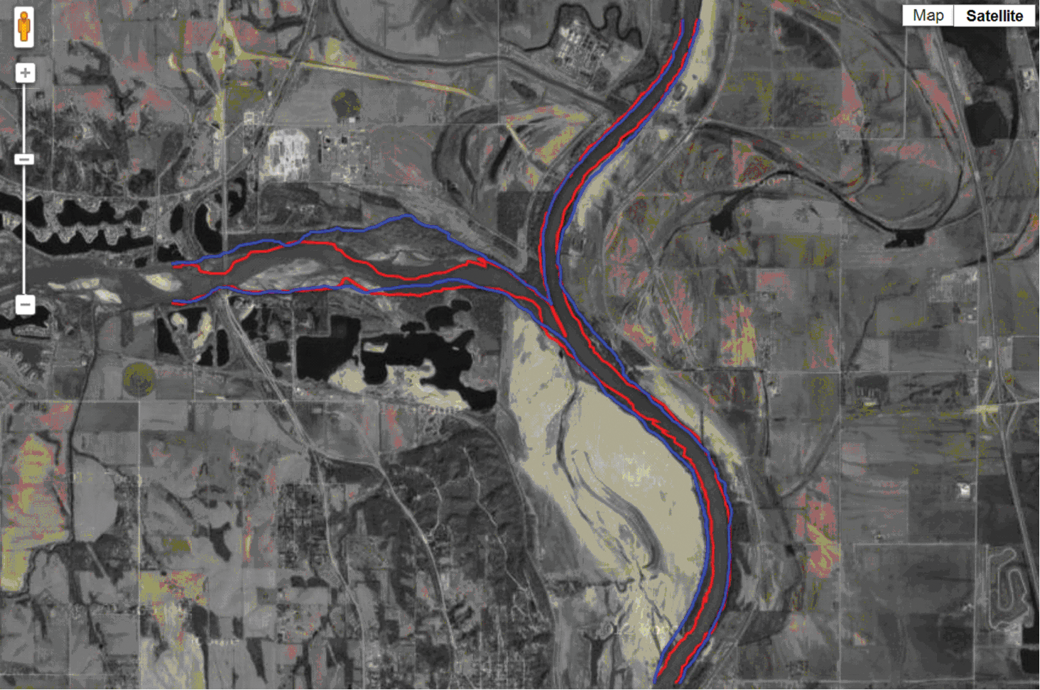 Displaying five layers at once can be confusing, as demonstrated in Figure 4. Comparison of the stream channels is easier after toggling some layers off. The basemap in this image is from 2012, a year after a historic flood occurred along the Missouri River. The tan area at the lower center of the image is a large sandbar that is devoid of vegetation as a result of the flooding.