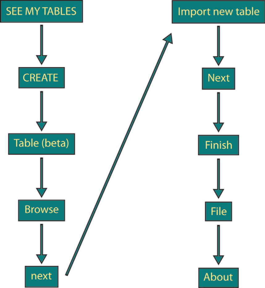 The following steps are performed to import a file to a Fusion Table. These steps are also illustrated in Figure 3. From the Google Docs Fusion Tables screen, the blue “See my tables” button was selected. Once in the Google Docs page, the red “Create” button was selected followed by “Table (beta)” from the drop down menu. “Browse” was then clicked and the appropriate KML file previously created was selected. After the filename was shown in the window, “next” was selected. From the “Import new table” window, “Next” was selected followed by “Finish.” The Fusion Table data was then displayed in a spreadsheet format. By selecting “File” from the Google Docs menu followed by “About”, the Numeric ID of the Fusion Table is available for reference.