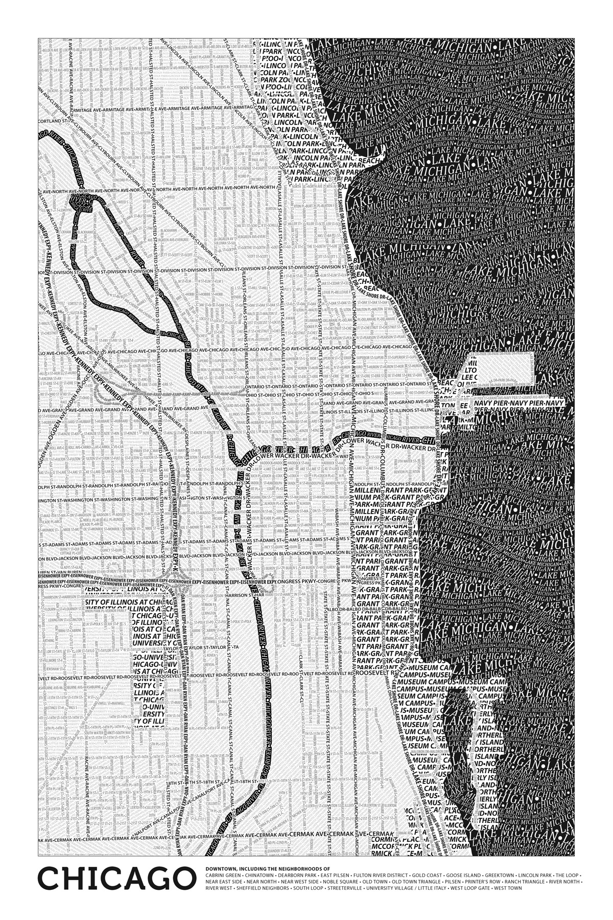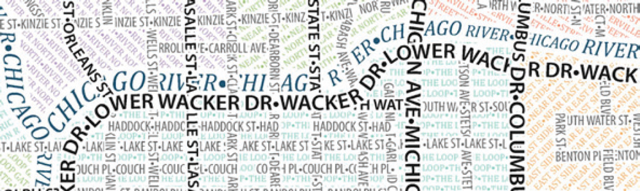 Axis Maps’ typographic map of Chicago is one in a series which includes depictions of Boston, New York, San Francisco, and Washington, D.C. On each map, the roads, rivers, neighborhoods, parks, and other features of the city are fashioned purely out of type. This form is not new; the first such map was introduced in 1773 in Germany1, but it is certainly not common. Axis Maps’ typographic maps aim to be both reference and art maps, and the tension between these goals drives the design decisions behind them. That tension has led to particular graphic choices, some in line with familiar, accepted conventions, and others that are innovative, artistic features that grab the viewer’s attention (Figure 1).