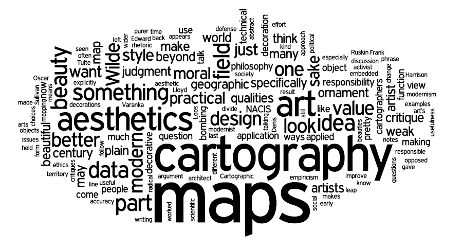 When we talk about aesthetics, it’s inevitable that at some point we will end up talking about art. Some argue that aesthetics is synonymous with the philosophy of art, in which case there’s little for us to discuss—our field and the fine arts may have regard for one another, but are clearly different in their approach to even basic questions of value. NACIS approached the broad topic of art and cartography in a special issue of Cartographic Perspectives in the winter of 2006. It was a well-intended effort, and it included some excellent resources, but reading the articles today it still feels as though we are talking past each other: the artists continue to talk art-talk, and the cartographers continue to talk map-talk.