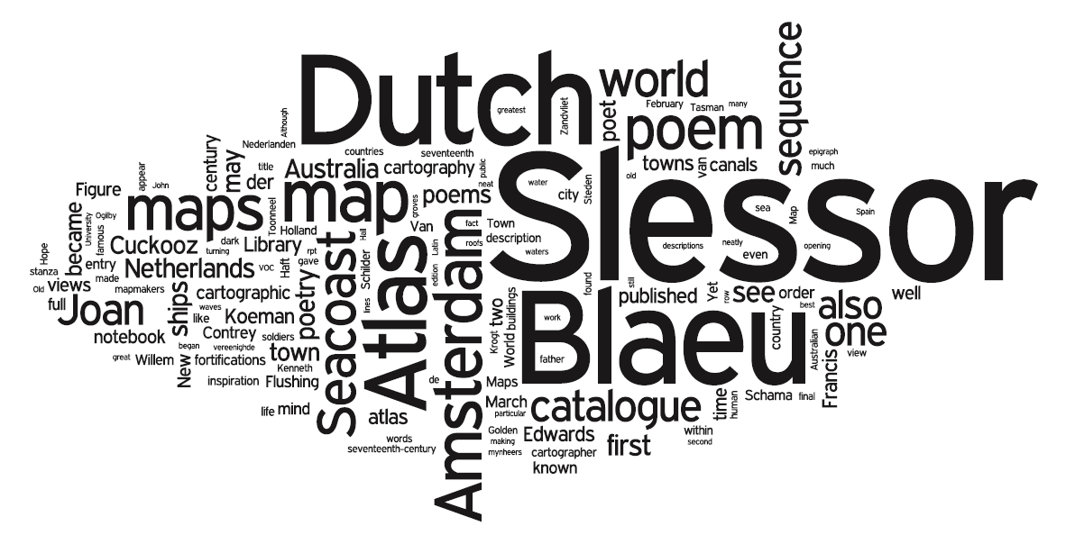 An intensely visual poet, Slessor was also attracted to lyrical descriptions of objects: his inspiration for “Dutch Seacoast” was a particularly poetic, but sparsely illustrated, catalogue of maps and atlases. After reprinting the poem and describing its reception, my paper traces the birth of “Dutch Seacoast” (and The Atlas generally) in Slessor’s poetry notebook, the evolution of the poem’s placement within the sequence, and the complex relationships between the poem, the catalogue, and Blaeu’s spectacular atlas. Comparing Blaeu’s idealistic view of Amsterdam with that city’s dominance during the Dutch “Golden Century,” Slessor’s darker obsessions with the poem’s ending, and his “other countries of the mind” with his native Australia, we come to understand why “Dutch Seacoast” remained for the self-deprecating poet one of his eight “least unsuccessful” poems.