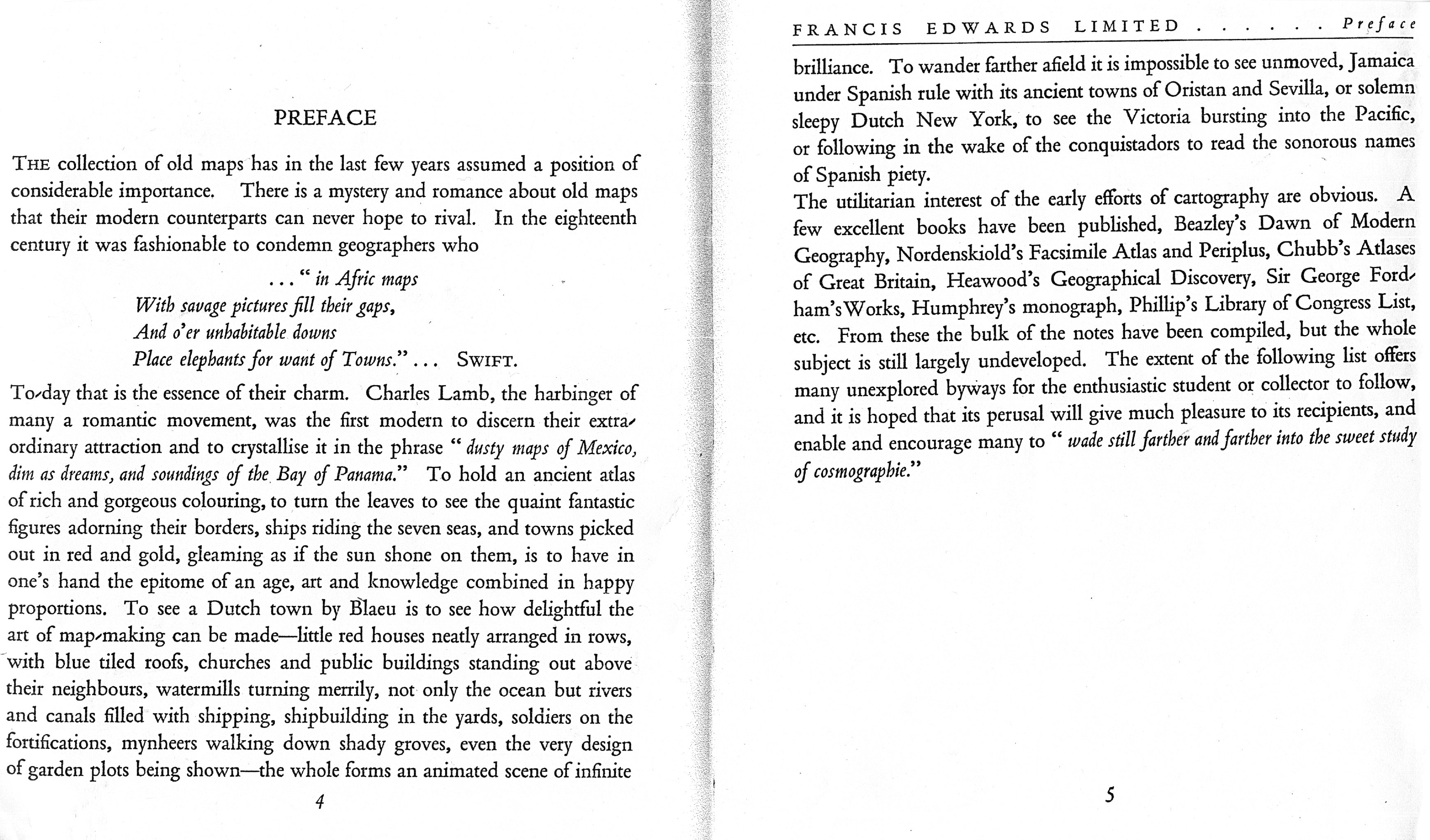 Figure 2: “Preface,” in the 1929 Francis Edwards catalogue Old Maps of the World, or Ancient Geography; a Catalogue of Atlases & Maps of All Parts of the World from XV Century to Present Day (Francis Edwards 1929, 4–5). Courtesy of the New York Public Library and of Francis Edwards Ltd.