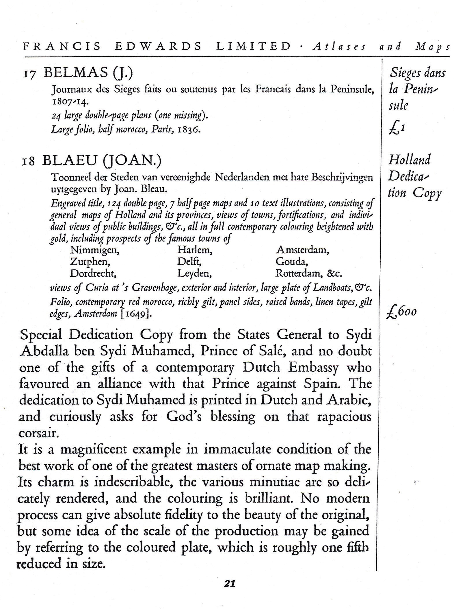 Figure 4: Description of Joan Blaeu’s Toonneel der Steden van [de] vereenighde Nederlanden (1649), item 18 in the 1929 Francis Edwards catalogue Old Maps of the World (Francis Edwards 1929, 21). This volume of Blaeu’s Town Atlas featured the northern—i.e., independent—part of the Netherlands; while the other volume, Toonneel der Steden van’s Konings Nederlanden, covered the southern part of the Netherlands, which had been reconquered by the King of Spain and, to this day, remains predominantly Catholic. That this magnificent copy of Blaeu’s “Theater of the Towns of the United Netherlands, with their Descriptions” was dedicated “from the States General to Sydi Abdalla ben Sydi Muhamed, Prince of Salé,” shows that “rapacious corsair[s]” of Northern Africa were as politically influential in the mid-seventeenth-century as they had been a generation earlier, the period in which “The King of Cuckooz” was set (1620–1621, The Atlas, poem 1; see Koeman 1970, 42). Courtesy of the New York Public Library and of Francis Edwards Ltd.