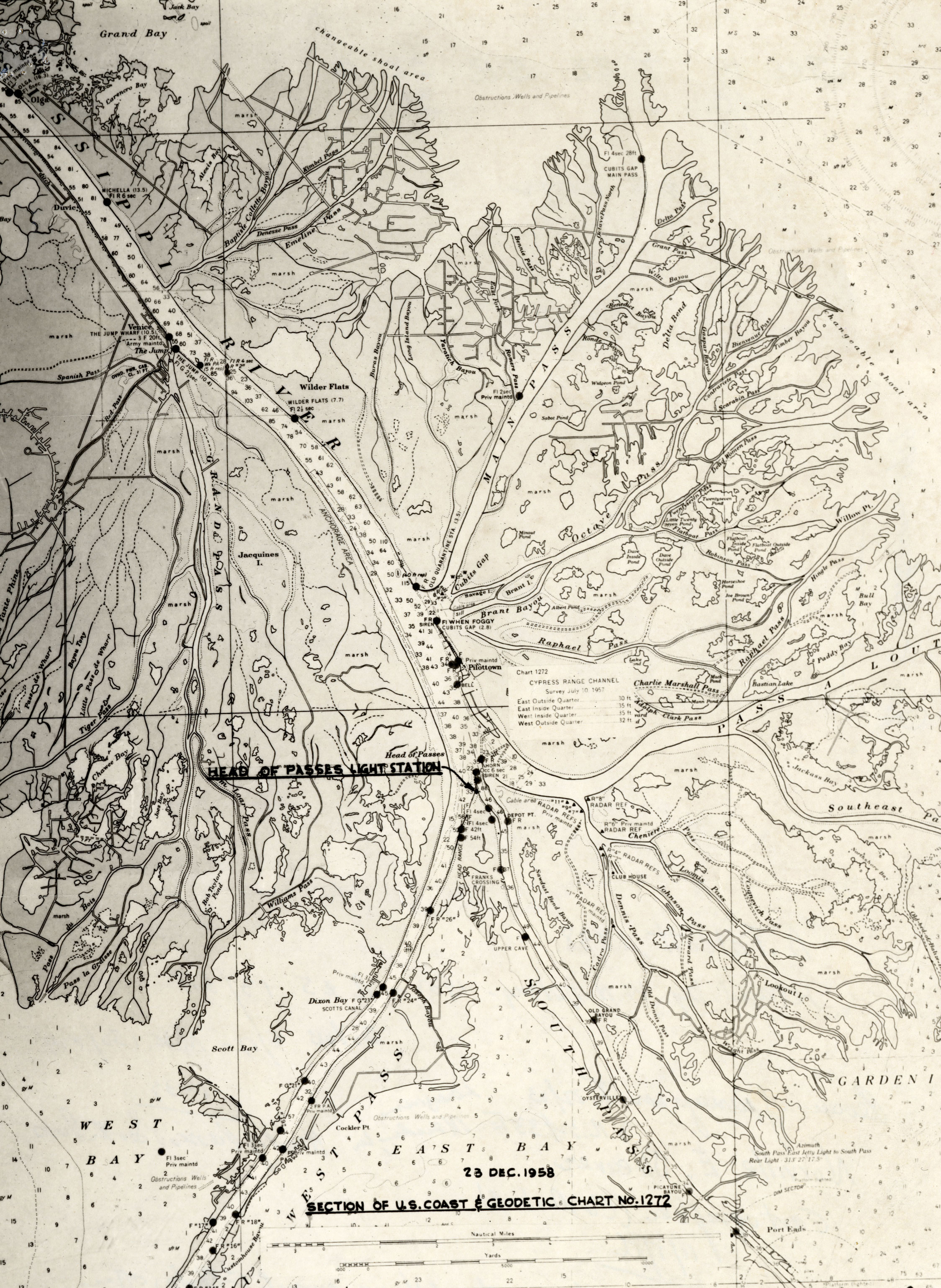 The Seghers were drawn to Plaquemines Parish when oil speculation began to boom along Louisiana’s wetlands. Guy J. Seghers, Sr. solicited the U. S. Coast Guard to develop a correct survey of the area between the Southwest Pass and the South Pass of the Mississippi River (Seghers 1959). He gathered together earlier surveys to document the need for more precise mapping (Figure 5). The Coast Guard responded that it believed there was a need for such a survey but the organization lacked the authorization to commission it and the funds to support it (Brallier 1959).