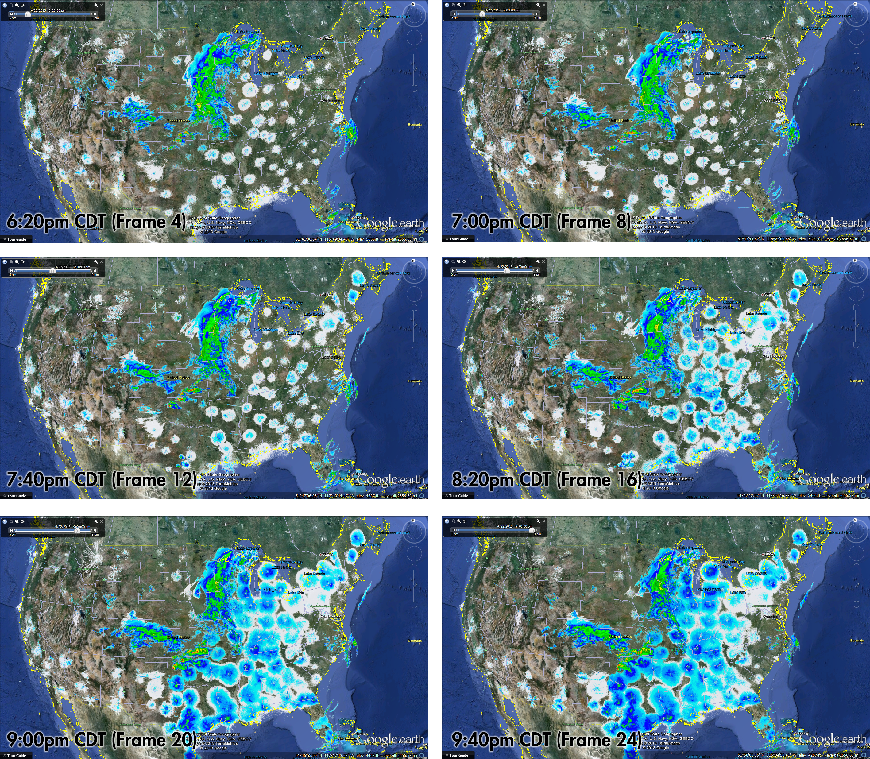 Once the PHP code execution has completed, the new KML file is ready to open in GE. Upon opening the KML file, GE will recognize the TimeSpan commands and individual frames from each groundoverlay section. While GE loads each of the 24 frames, it works best to manually advance the time steps on the TimeSpan slider bar the first time through, allowing a few moments for each frame to load. Once they have loaded, you can open the Date and Time Options (click on the wrench icon on the TimeSpan control bar), then adjust the loop animation speed and check the Loop Animation box if desired. Once started, the animation will run in a continuous loop, and the user can zoom in, pan and rotate around any feature of interest, utilizing the full capabilities of GE. As an example, several images from the animated loop of April 22, 2013 can be seen in Figure 1. This particular KML file is available for download at: http://bdmuller.comeze.com/ Project/radar.kml.